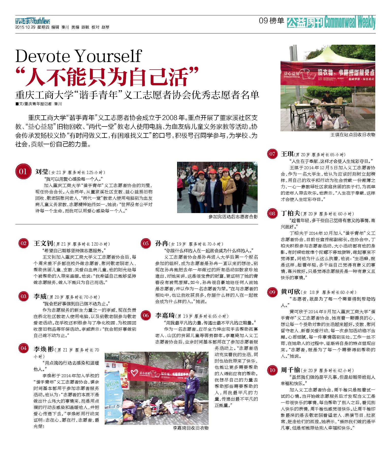 beat365艺术学院影视动画分院于2008年成立“谐手青年”义工志愿者协会。一直以来,全体志愿者们全心全意致力于为社会贡献自己的爱心与力量!重点开展了董家溪市民学校支教、“益心益易”旧物回收、“两代一堂”教老人使用电脑、为血友病儿童义务家教等活动。该义协传承校义协“有时间做义工,有困难找义工”的口号,积极号召同学们参与志愿者服务活动,为学校、社会奉献自己的青春和力量。重庆青年报于 2015年10月29日在公益周刊...