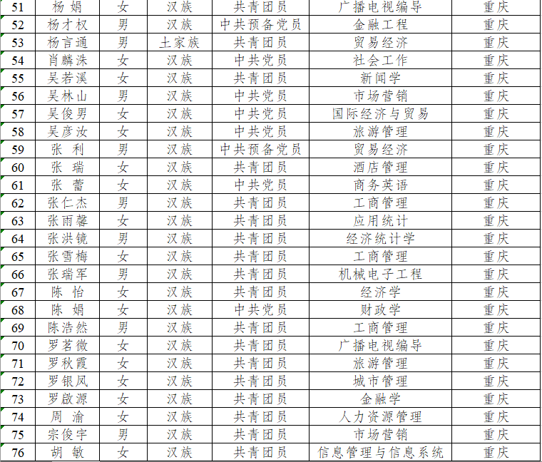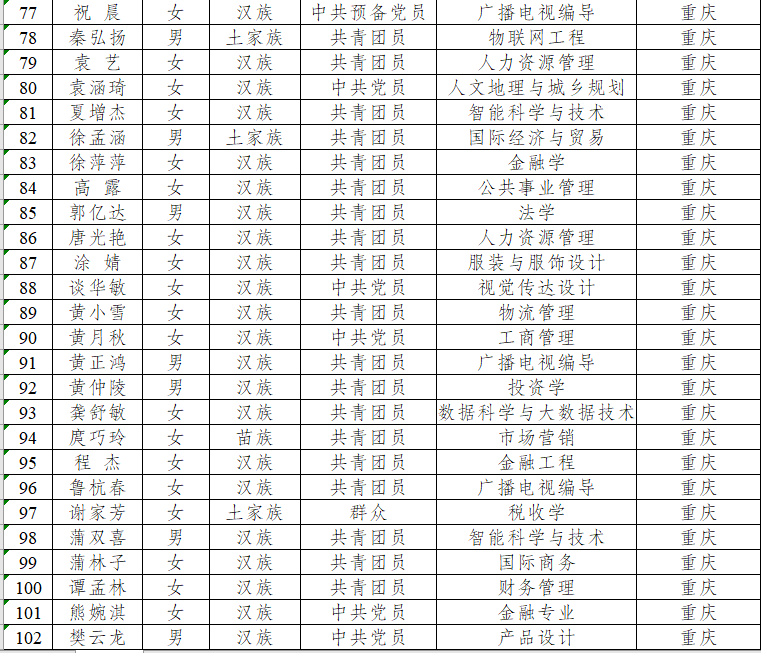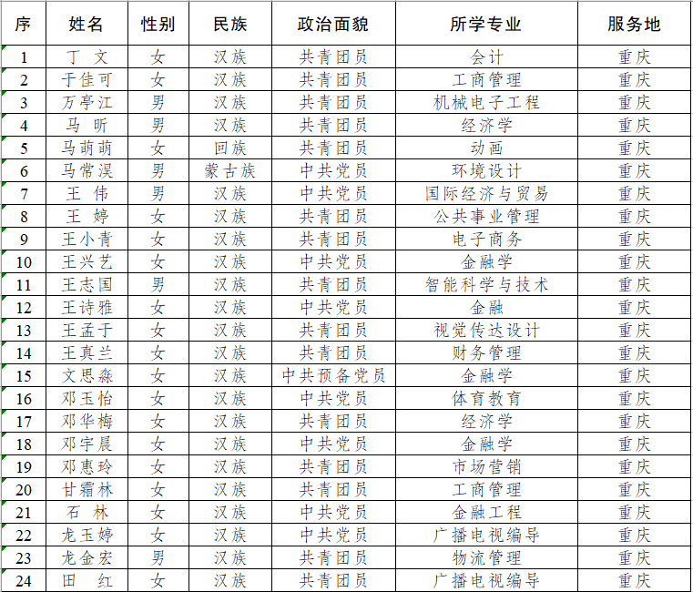 按照重庆市西部计划项目办的统一部署和安排,经学生本人报名、各学院推荐、校团委审核、重庆市各区县项目办招募考核等环节,根据市项目办的反馈,beat365入围2023年西部计划市内服务共104人,现将名单公示如下: