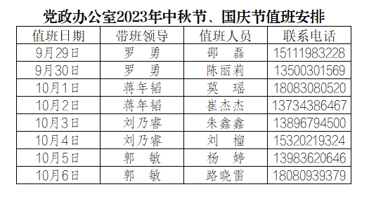 为更好地服务全校师生,保障中秋节、国庆节期间学校相关工作顺利开展,党政办公室已安排值班人员,负责学校校章、党委印章、法人印章、学校合同章、党政办公室印章等用印,学校介绍信开具,公文签发审核,会议室申请及使用等工作,请需求单位或师生按规定流程履行签批手续,其他未尽事宜,请与值班老师联系。