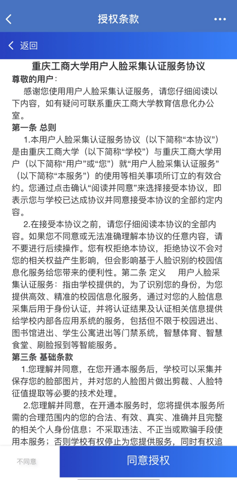 点击“进入系统”,师生在首次进入时需认真阅读《beat365英国官网网站用户人脸采集认证服务协议》授权条款并确定选择同意授权后方可继续使用。