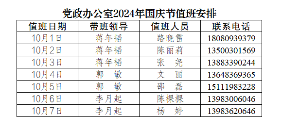 为更好地服务全校师生,保障国庆节期间学校相关工作顺利开展,党政办公室每天均安排值班人员,负责学校校章、党委印章、法人印章、学校合同章、党政办公室印章等用印,学校介绍信开具,公文签发审核,会议室申请及使用等工作,请需求单位或师生按规定流程履行签批手续,其他未尽事宜,请与值班老师联系。