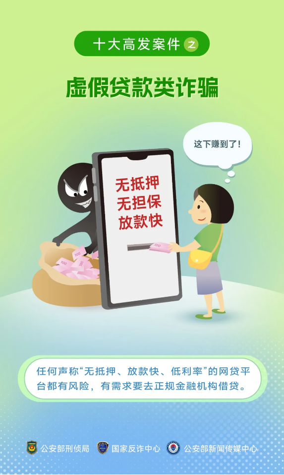 诈骗分子通过网站、电话、短信、社交平台等渠道发布“低息贷款”“快速到账”等信息,诱骗受害人前往咨询。后冒充银行、金融公司工作人员联系受害人,谎称可以“无抵押”“免征信”“快速放贷”等,引诱受害人下载虚假贷款APP或登录虚假网站,再以收取“手续费”“保证金”“代办费”等为由,诱骗受害人转账汇款。诈骗分子还常以“刷流水验资”为由,诱骗受害人将其银行卡寄出,用于转移涉案资金。此类诈骗的受骗人群多为有迫切贷款需求、急需资金周转的人员。