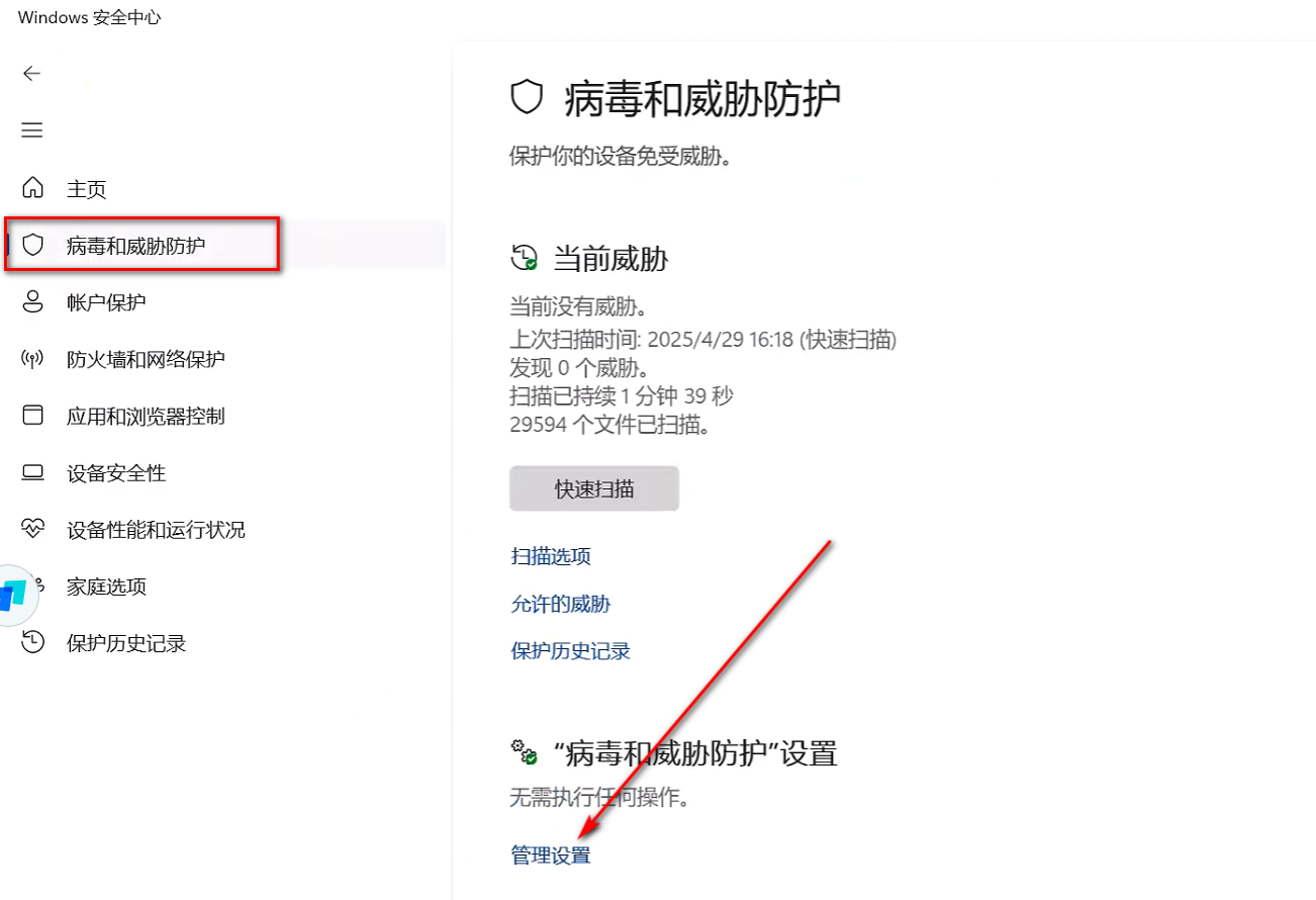4)接着在“‘病毒和威胁防护’设置”中点击“管理设置”