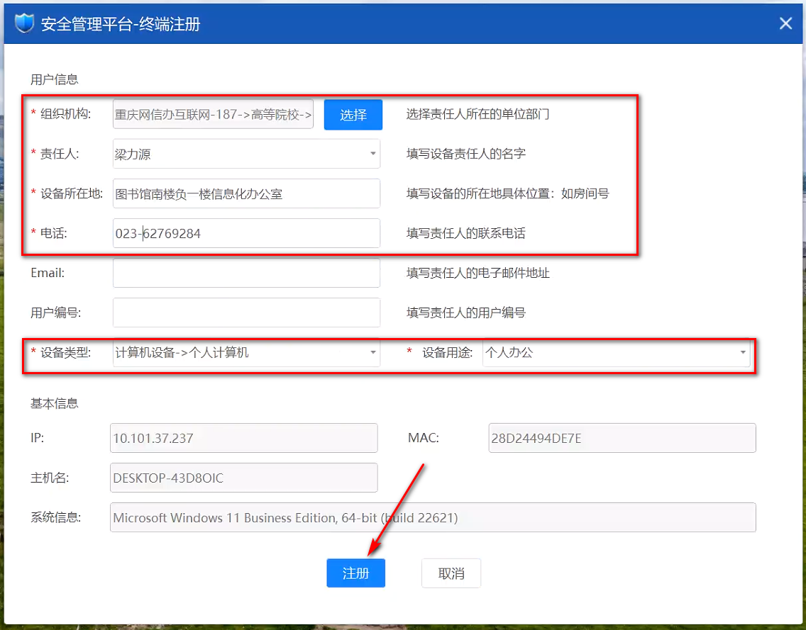 2)按实际情况填写以下信息,填写完后点击“注册”: