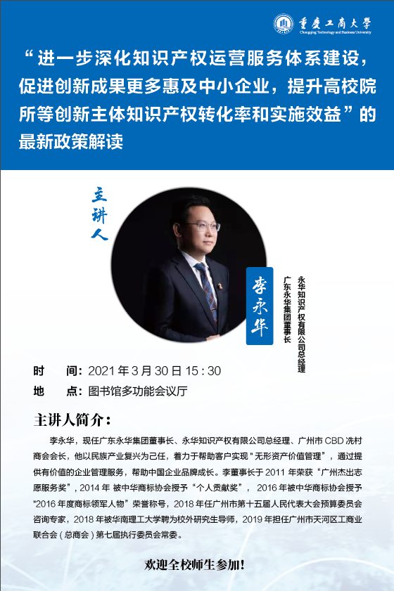 为推进知识产权强校建设,促进beat365科技创新,加快科技成果的转化,为广大师生开展创新活动提供更好、更专业的服务,beat365英国官网网站科技成果转化中心和会计学院共同举办“进一步深化知识产权运营服务体系建设,提升高校院所等创新主体知识产权转化率和实施效益”的最新政策解读讲座,现将有关事项通知如下:
