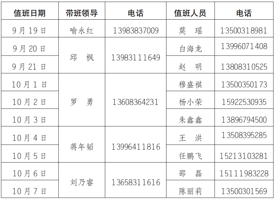 为更好地服务全校师生,保障中秋节、国庆节期间学校校章、党委印章、法人印章、学校合同章、党政办公室印章等用印,学校介绍信开具,公文签发审核,会议室申请及使用等工作顺利开展,现将值班安排公布如下,请需求单位或师生按规定流程履行签批手续。