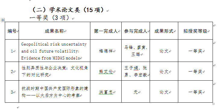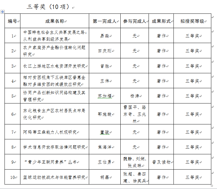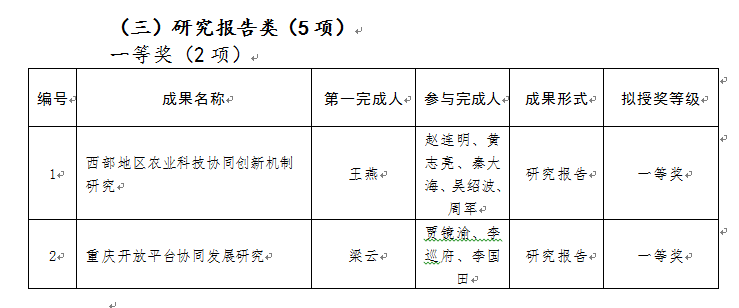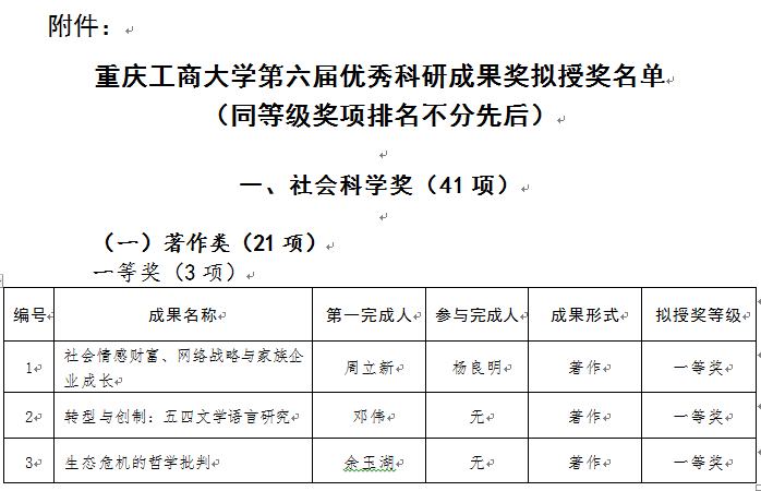 按照《beat365英国官网网站科学研究奖实施办法》和《关于组织申报beat365英国官网网站第六届优秀科研成果奖的通知》,参照国家科学技术奖、重庆市科学技术奖及重庆市社科优秀成果奖的评价指标体系,本着创新导向,质量优先,宁缺毋滥的原则,科研处组织校外专家成立若干学科评审组对申报成果进行评审。专家按照评分细则对申报成果进行了独立评审和投票表决。综合专家评审意见和授奖建议,形成了beat365英国官网网站第六届优秀科研成果拟授奖名单,拟授奖成果共计49项。现将《beat365英国官网网站第六届优秀科研成果奖拟授奖名单》予以公示。