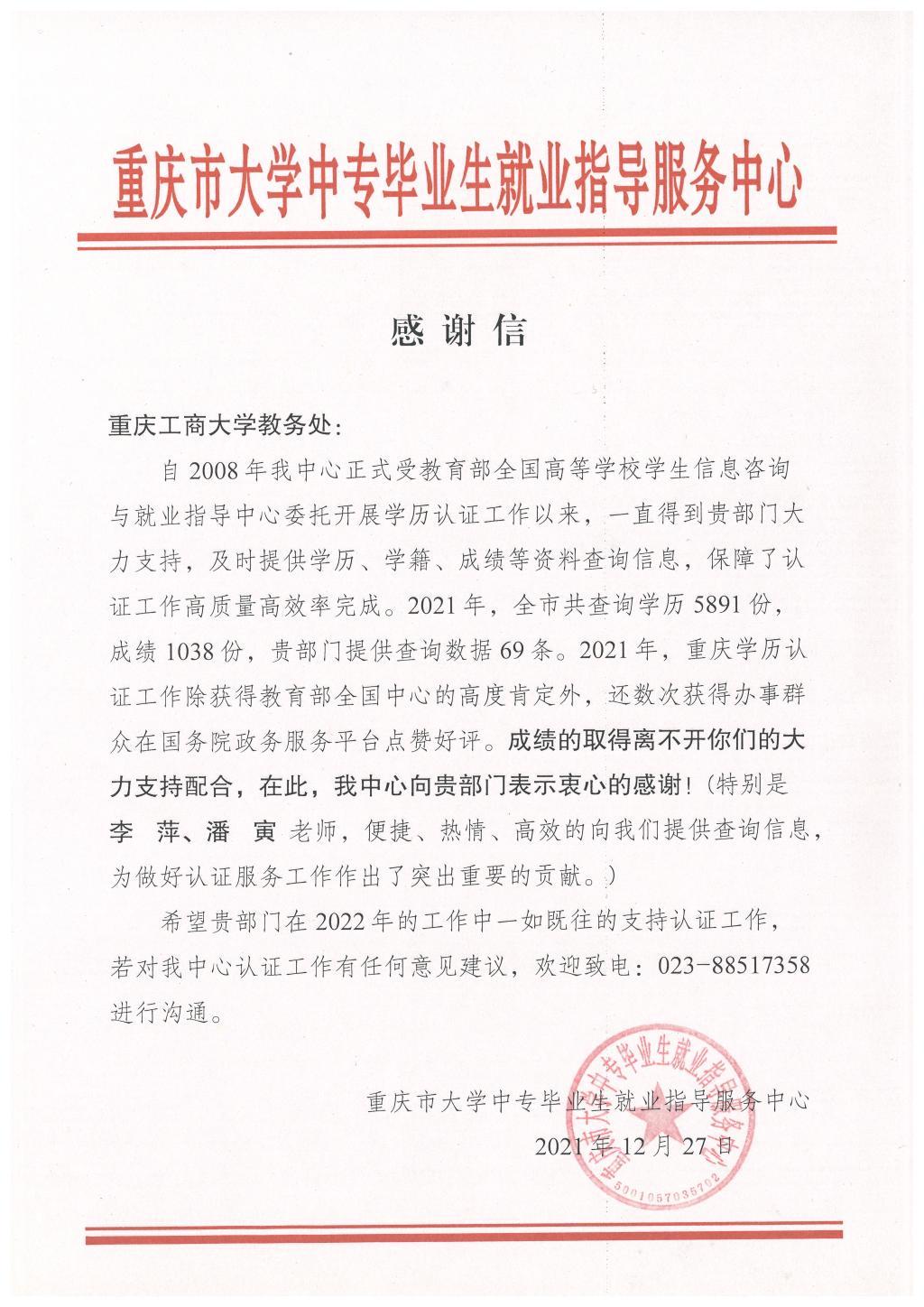近日,重庆市大学中专毕业生就业指导服务中心向beat365教务处发来感谢信,对beat365在2021年的学籍管理工作和相关教师作出肯定和表扬。学校学籍管理工作人员常年为校友提供学历、学籍、成绩等方面的服务,得到了相关部门和广大校友的肯定。