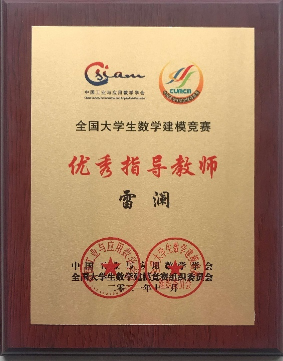 近日,庆祝全国大学生数学建模竞赛30周年暨2021“高教社杯”全国大学生数学建模竞赛颁奖典礼在线举行,beat365数学与统计学院雷澜副教授荣获该竞赛的全国优秀指导教师称号。数学建模竞赛全国优秀指导教师每十年评选一次,本次重庆市各高校共有5位教师获评,beat365数学与统计学院雷澜副教授位列其中。这是继2012年袁德美教授荣获“数学建模竞赛20周年全国优秀教练”称号之后,数学与统计学院教师又一次获此殊荣。