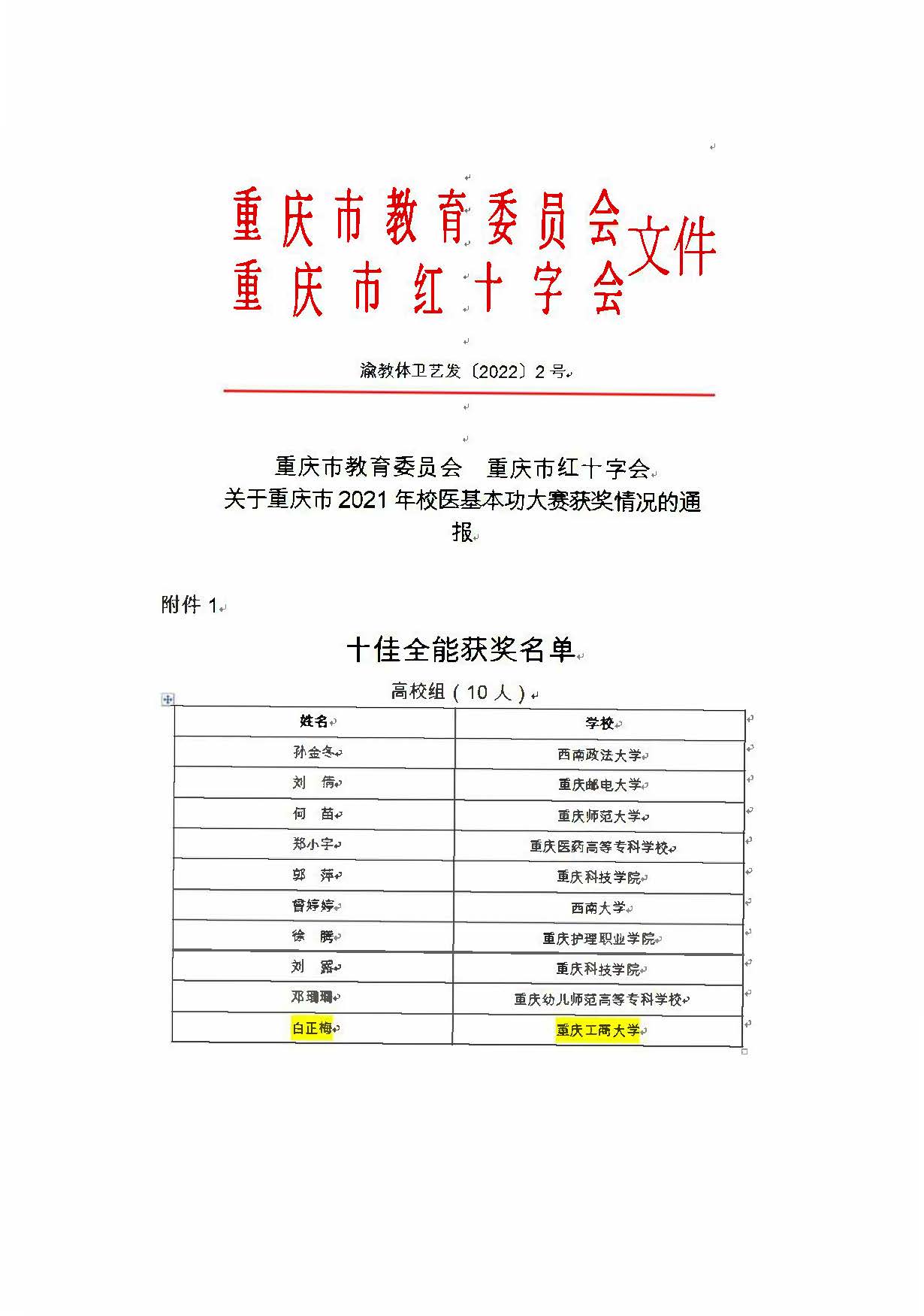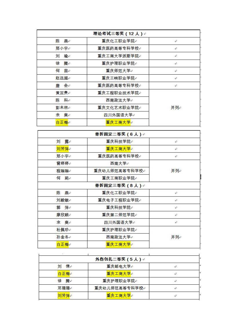 由重庆市教育委员会、重庆市红十字会主办,西南大学、重庆市中小学卫生保健所承办的重庆市校医基本功大赛于2021年12月12-14日在西南大学举行,beat365校医院精心组织、积极备战,经过与全市其他高校医院激烈角逐,最终beat365校医院勇夺佳绩,取得二等奖3个、三等奖2个,白正梅同志获得十佳校医荣誉称号,学校获得优秀组织奖,校医院负责人获得优秀组织者奖。