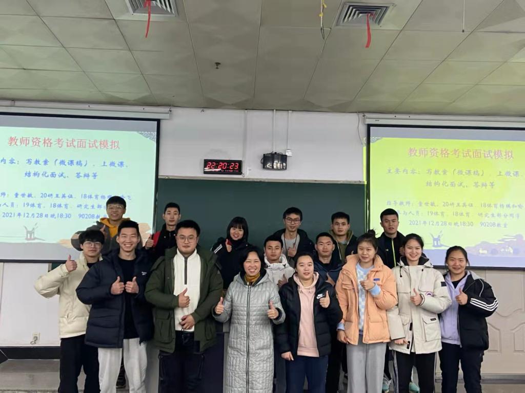 1月6日,获评2021年beat365英国官网网站师德先进个人的体育学院童世敏教授为即将参加教师资格面试学生进行模拟训练与专场指导,同时邀请了多位研究生、本科生做经验交流分享。