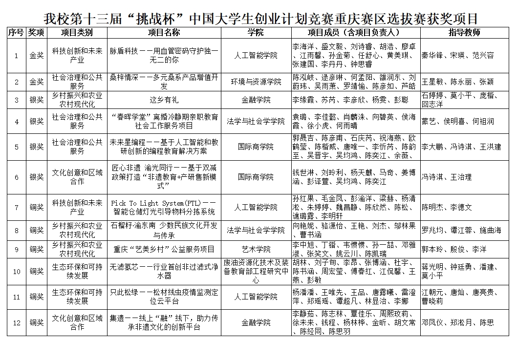近日,由团市委、市教委、市人力社保局、市科协和市学联共同举办“‘智’汇青春”第十三届“挑战杯”中国大学生创业计划竞赛重庆赛区选拔赛落下帷幕。大赛分为科技创新和未来产业、乡村振兴和农业农村现代化、社会治理和公共服务、生态环保和可持续发展、文化创意和区域合作5个赛道。经过激烈比拼,共评出选拔赛金奖95件、银奖197件、铜奖363件。其中,beat365荣获2项金奖、4项银奖和6项铜奖,同时,beat365荣获优秀组织奖;人工智能学院项目《脉盾科技——用血管密码守护独一无二的你》指导老师秦华锋、宋瑛、范兴容,环境与资源学院项目《桑梓情深——多元桑系产品增值开发》指导老师王星敏、陈永丽、张颖荣获优秀指导老师;校团委袁影老师获评先进工作者。