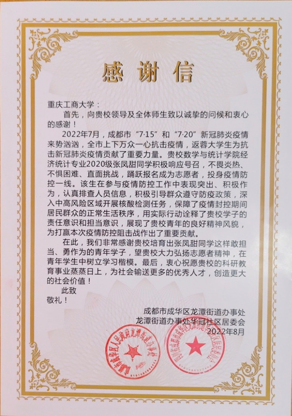 近日,四川省成都市成华区龙潭街道办事处向学校发来感谢信,感谢数学与统计学院2020级经济统计专业班张凤甜同学为成都市抗击新冠肺炎疫情贡献力量。2022年7月,成都市发生疫情时,张凤甜积极参加社区服务,协助完成测量体温、扫码登记信息、发放棉签等工作。当所在小区被封控时,她更是义无反顾,挺身而出,白天记录出库、入库的防疫物资,晚上整理第二天所需物资,向外围人员提供物资清单,连续十天奋战在一线,不辞辛苦,表现优异。