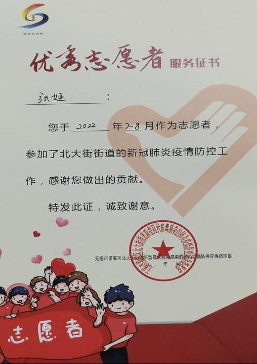 2022年6月28日,江苏省无锡市突发疫情。beat3652022级通识学院新传六班的张娅第一时间申请加入“溪”有青年志愿者团队,参与到抗击疫情攻坚战中。在社区担任核酸志愿者期间,她帮助群众扫描证件及二维码,协助社区开展核酸工作。穿上防护服,忍受着高温炙烤,尽管室外工作十分艰辛,但张娅从未想过退却。她说:“作为一名青年大学生,我要为社会做一些力所能及的贡献。”