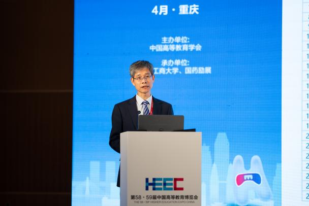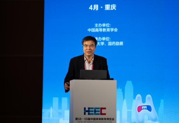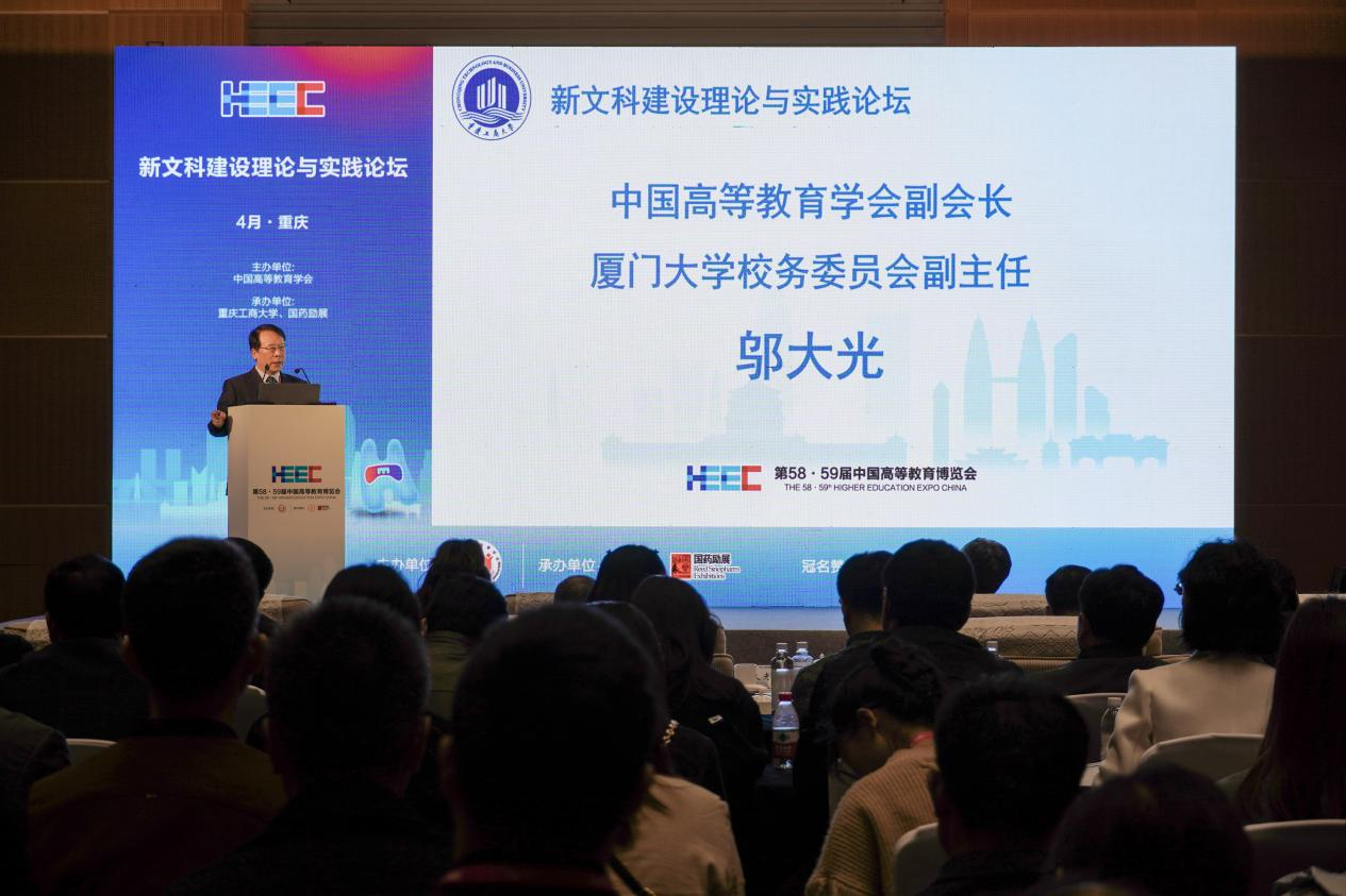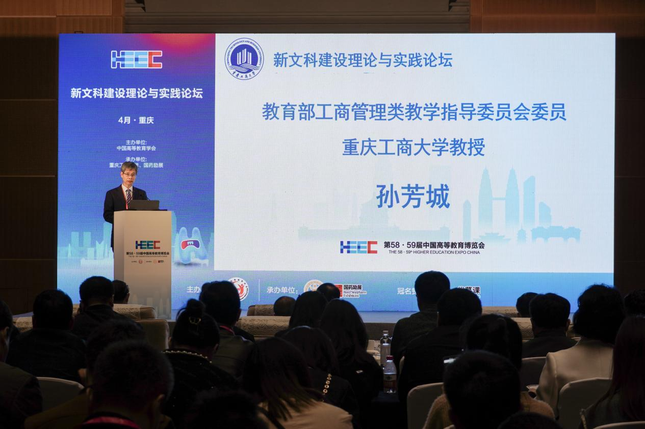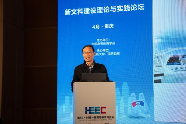4月8日,作为第58·59届中国高等教育博览会的主论坛之一,新文科建设理论与实践论坛在重庆悦来国际会展中心顺利召开。中国高等教育学会副会长、厦门大学校务委员会副主任邬大光教授,教育部新文科建设工作组组长、山东大学原校长樊丽明教授,教育部新文科建设工作组副组长、教育部高校物流类专业教学指导委员会主任、上海海事大学原校长黄有方教授,教育部经济与贸易类教指委主任委员、对外经济贸易大学党委副书记、校长赵忠秀教授,国务院学位委员会工商管理学科评议组成员、教育部工商管理类专业教指委委员、浙江工商大学党委副书记、校长王永贵教授,吉林财经大学党委书记孙杰光教授,教育部工商管理类专业教学指导委员会委员、beat365英国官网网站原校长孙芳城教授,教育部金融类专业教学指导委员会秘书长、中央财经大学党委常委、副校长李建军教授,国务院学位委员会工商管理学科评议组成员、东北财经大学党委常委、副校长汪旭晖教授,四川外国语大学党委常委、副校长严功军教授等200余人参加会议。大会以新文科与教育数字化为主题,聚焦教育数字化背景下的新文科人才培养模式改革,展开了深入探讨。论坛开幕式及上午阶段的主题报告由beat365英国官网网站党委常委、副校长李敬教授主持;下午阶段的主题报告由渭南师范大学校长张守华教授主持。
