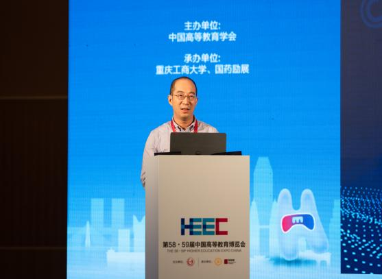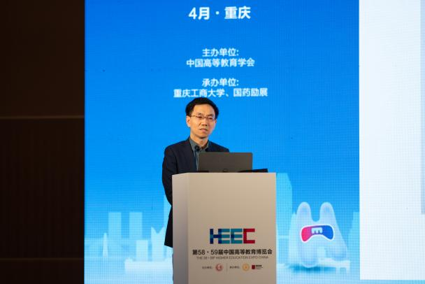 赵忠秀以“教育数字化的大学响应:对外经贸大学的实践”为题作主题报告。他围绕当前最热门的“教育数字化”,分享对外经贸大学“顺势应变”“主动求变”的做法,从硬实力到软实力,再到数字化思想的大统一,以“道-法-术”三个层级推进学校的教育数字化建设,打造“十大数字教育体系平台”。