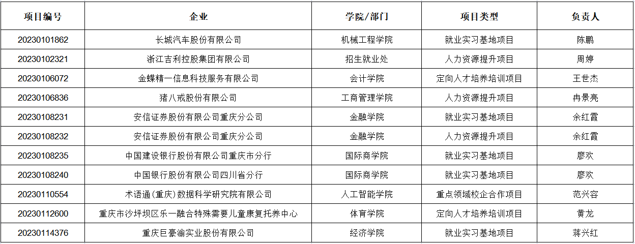 4月6日,教育部高校学生司发布《关于公布第二期供需对接就业育人项目立项名单的通知》(教学司函〔2023〕6号),beat365与长城汽车股份有限公司、浙江吉利控股集团有限公司、金蝶精一信息科技服务有限公司、猪八戒股份有限公司、安信证券股份有限公司重庆分公司、中国建设银行股份有限公司重庆市分行、中国银行股份有限公司四川省分行、术语通(重庆)数据科学研究院有限公司、重庆市沙坪坝区乐一融合特殊需要儿童康复托养中心、重庆巨豪渝实业股份有限公司10家用人单位联合申报的人力资源提升、就业实习基地、定向人才培养培训、重点领域校企合作项目11个项目获批立项,较2022年新增9项。