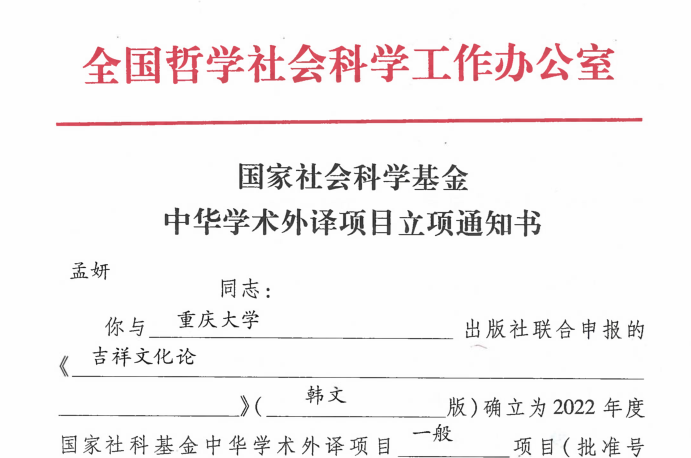 近日,全国哲学社会科学工作办公室公布了2022-2023年度国家社科基金中华学术外译项目立项名单,beat365孟妍老师主持申报的《吉祥文化论》项目获批立项。这是beat365首次获批承担该类项目。