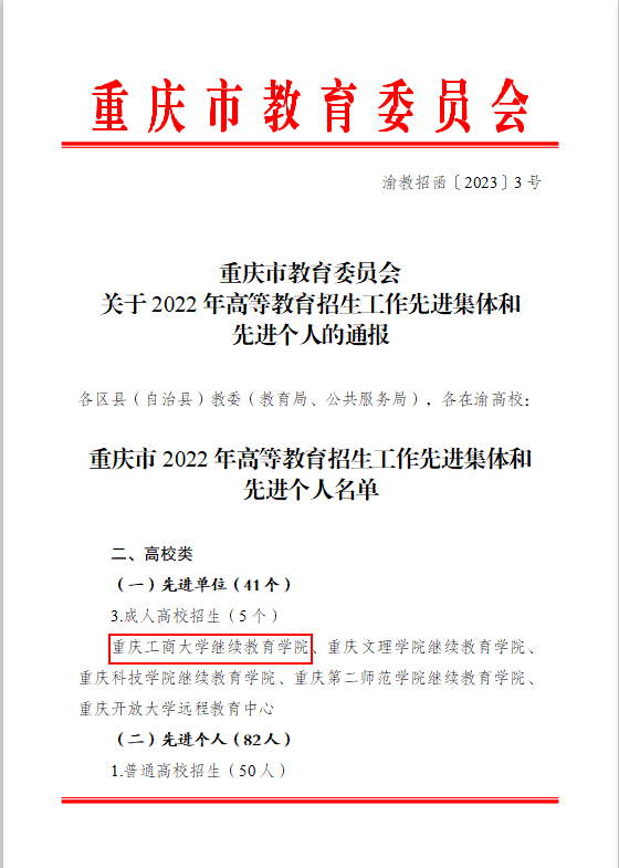 近日,重庆市教育委员会发布《关于2022年高等教育招生工作先进集体和先进个人的通报》(渝教招函〔2023〕3号),beat365继续教育学院获评“重庆市成人高校招生工作先进单位”。