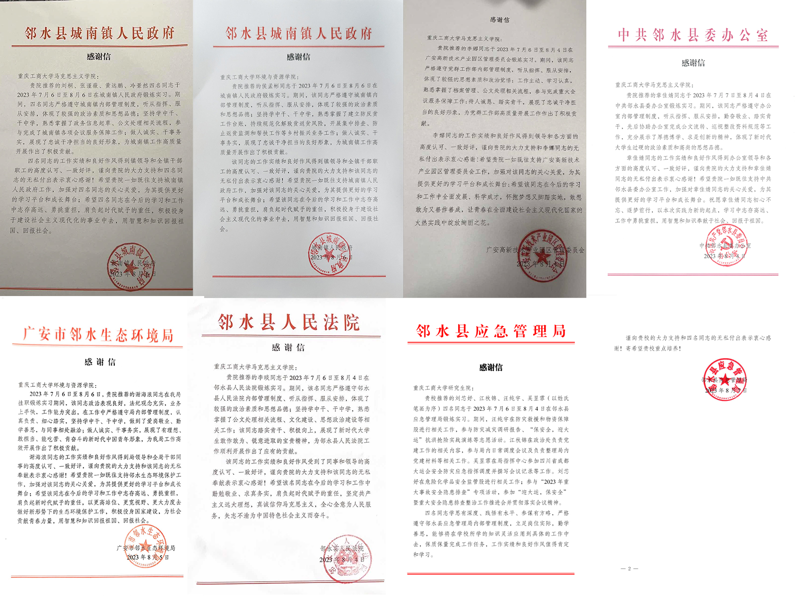 此次社会实践,共16个实践锻炼单位提供36个实践锻炼岗位。挂职锻炼的内容主要包括社会观察、文秘工作、业务学习和专业实践。同学们主要在相关单位、部门的对口专业岗位进行挂职。挂职锻炼期间,同学们始终铭记习近平总书记对青年学子的殷切期望,砥砺奋斗、艰苦奋斗、顽强奋斗;立足岗位、扎根基层;在实践中磨炼意志,提升自我;在这个充满激情和活力的盛夏充分展现重工商大青年良好的精神风貌和优良的综合素质,得到挂职锻炼单位领导、员工的表扬与肯定。挂职锻炼结束后,各实践单位对同学们的辛苦付出表示感谢,纷纷发来感谢信。