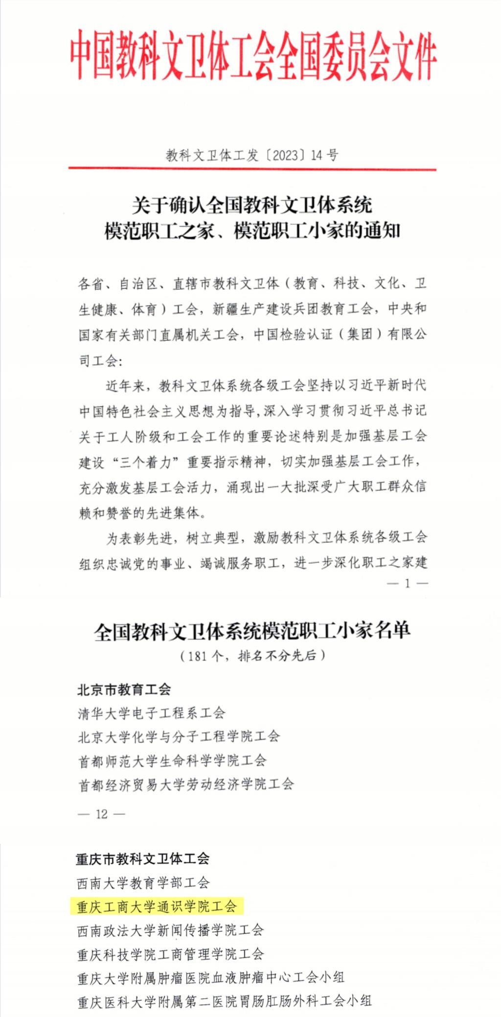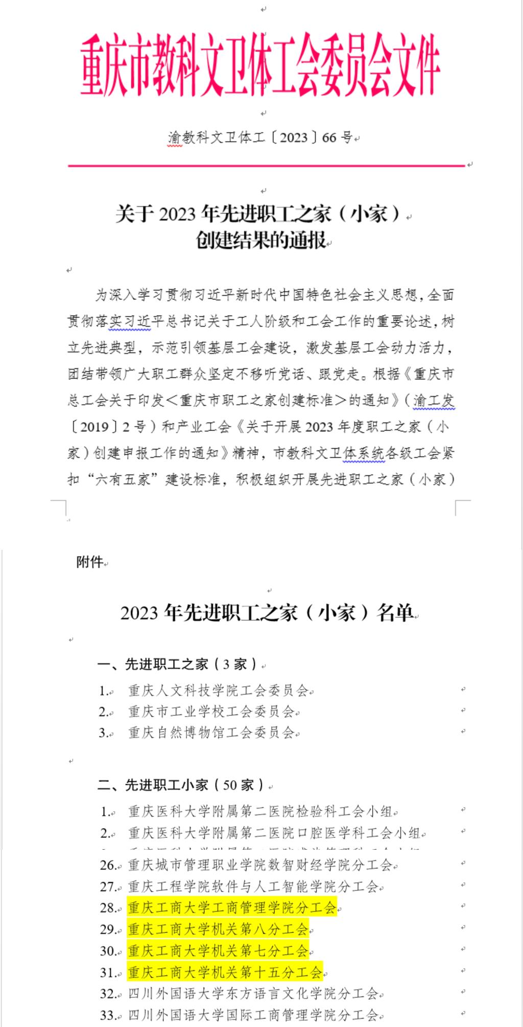 同时,重庆市教科文卫体工会委员会发布《关于2023年先进职工之家(小家)创建结果的通报》,beat365工商管理学院工会、机关工会第七分工会、机关工会第八分工会、机关工会第十五分工会四家职工小家荣获重庆市教科文卫体工会系统先进职工小家荣誉称号。