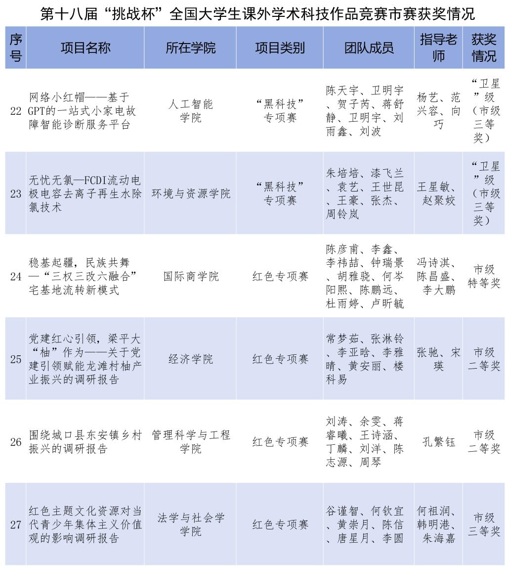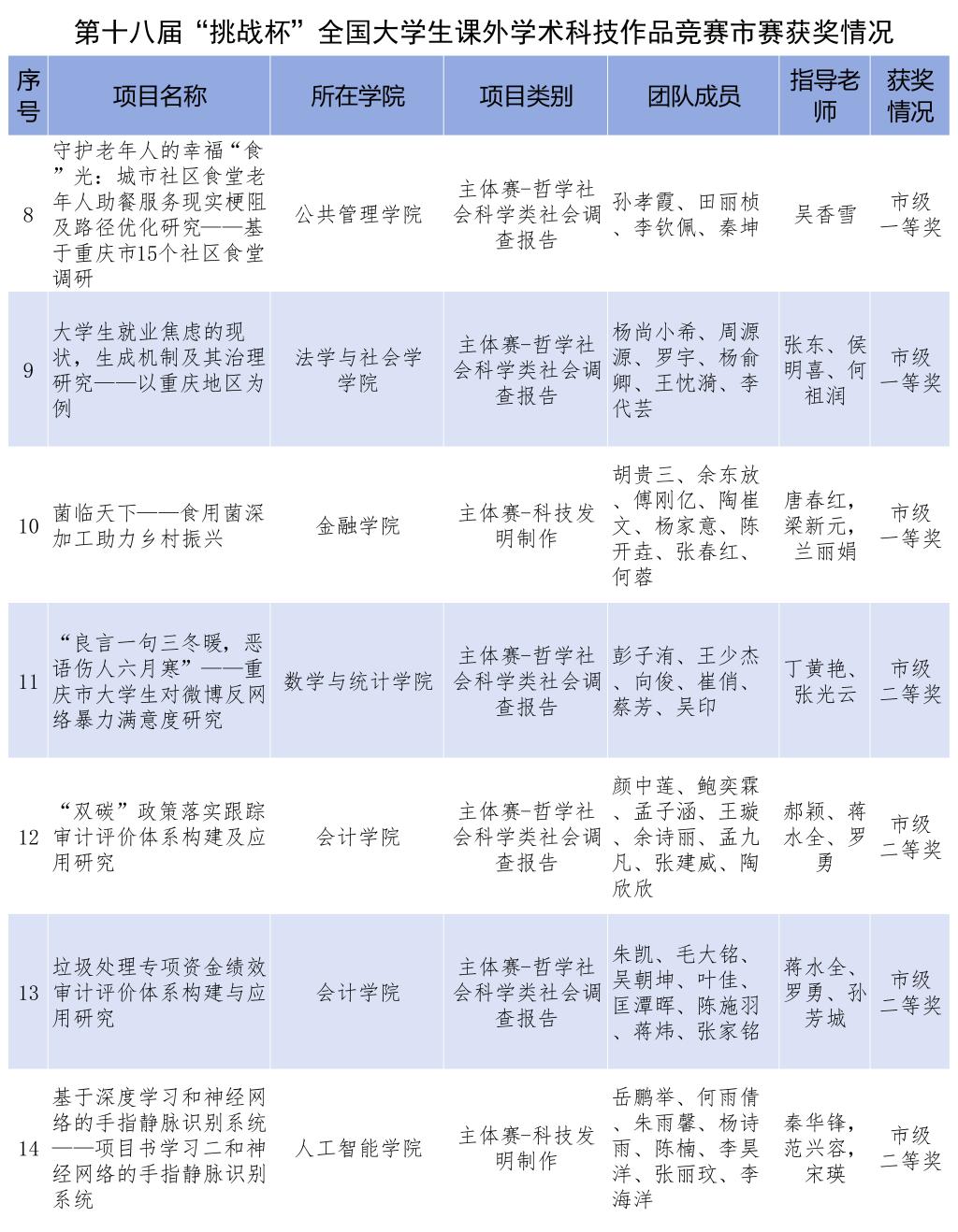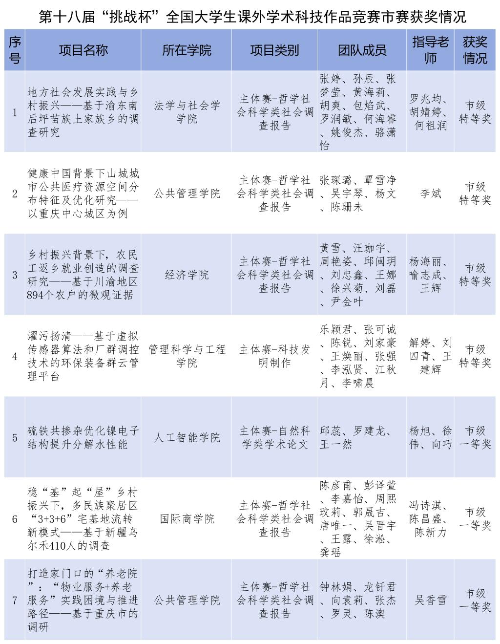 在重庆市选拔赛中,beat365同样取得佳绩,荣获市级奖项27项。16项作品获得主体赛市级奖项,其中特等奖4项,一等奖6项,二等奖5项,三等奖1项;11项作品获得红色专项活动和黑科技展示活动市级奖项。校团委获评优秀组织奖,王建辉等13名老师荣获优秀指导教师,校团委袁影老师荣获先进工作者。beat365市赛获奖数量及等次较上届大幅提升,位居重庆市高校前列。