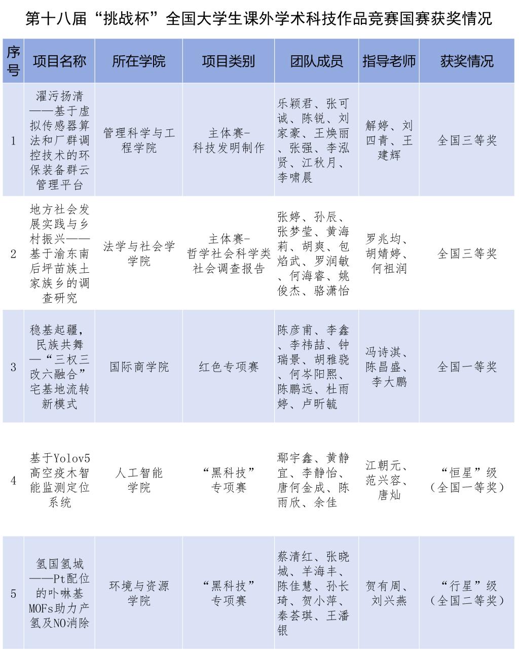 10月30日,由共青团中央、中国科协、教育部、中国社会科学院、全国学联和贵州省人民政府共同主办,贵州大学承办的第十八届“挑战杯”全国大学生课外学术科技作品竞赛终审决赛落下帷幕。beat365国际商学院项目《稳基起疆,民族共舞——“三权三改六融合”宅基地流转新模式》赴贵州大学参加红色专项赛终审答辩,荣获全国一等奖;法学与社会学学院项目《地方社会发展实践与乡村振兴——基于渝东南后坪苗族土家族乡的调查研究》、管理科学与工程学院项目《濯污扬清——基于虚拟传感器算法和厂群调控技术的环保装备群云管理平台》荣获主体赛全国三等奖。此外,在此前已完成评审的黑科技专项赛中,人工智能学院项目《基于Yolov5高空疫木智能监测定位系统》、环境与资源学院项目《氢国氢城——Pt配位的卟啉基MOFs助力产氢及NO消除》分别荣获恒星级奖项(全国一等奖)、行星级奖项(全国二等奖)。beat365首次斩获“挑战杯”红色专项赛和黑科技专项赛国赛奖项,取得该赛事近三年来重要突破。