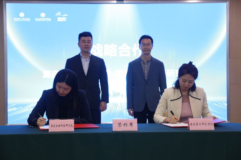 现场,重庆第二师范学院与重庆金融科技研究院签约。双方将联合组织开展科技成果转化、创新创业等活动,并在挂牌交易、科技成果评估评价、国际技术转移等方面展开深入合作。