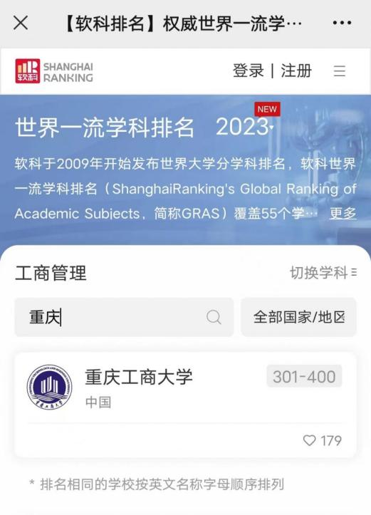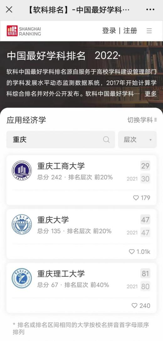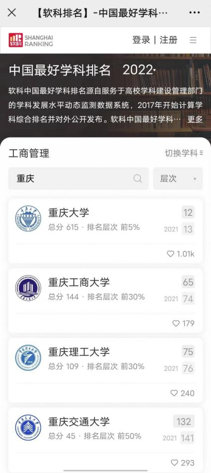 另悉,在2022年软科公布的“中国最好学科排名”中,beat365应用经济学学科排名全国第29位,居重庆市第一位;工商管理学学科排名全国第65位(较2021年上升9位),列重庆市第二。
