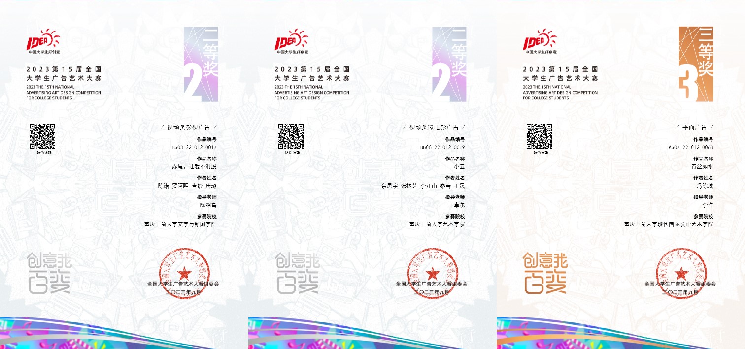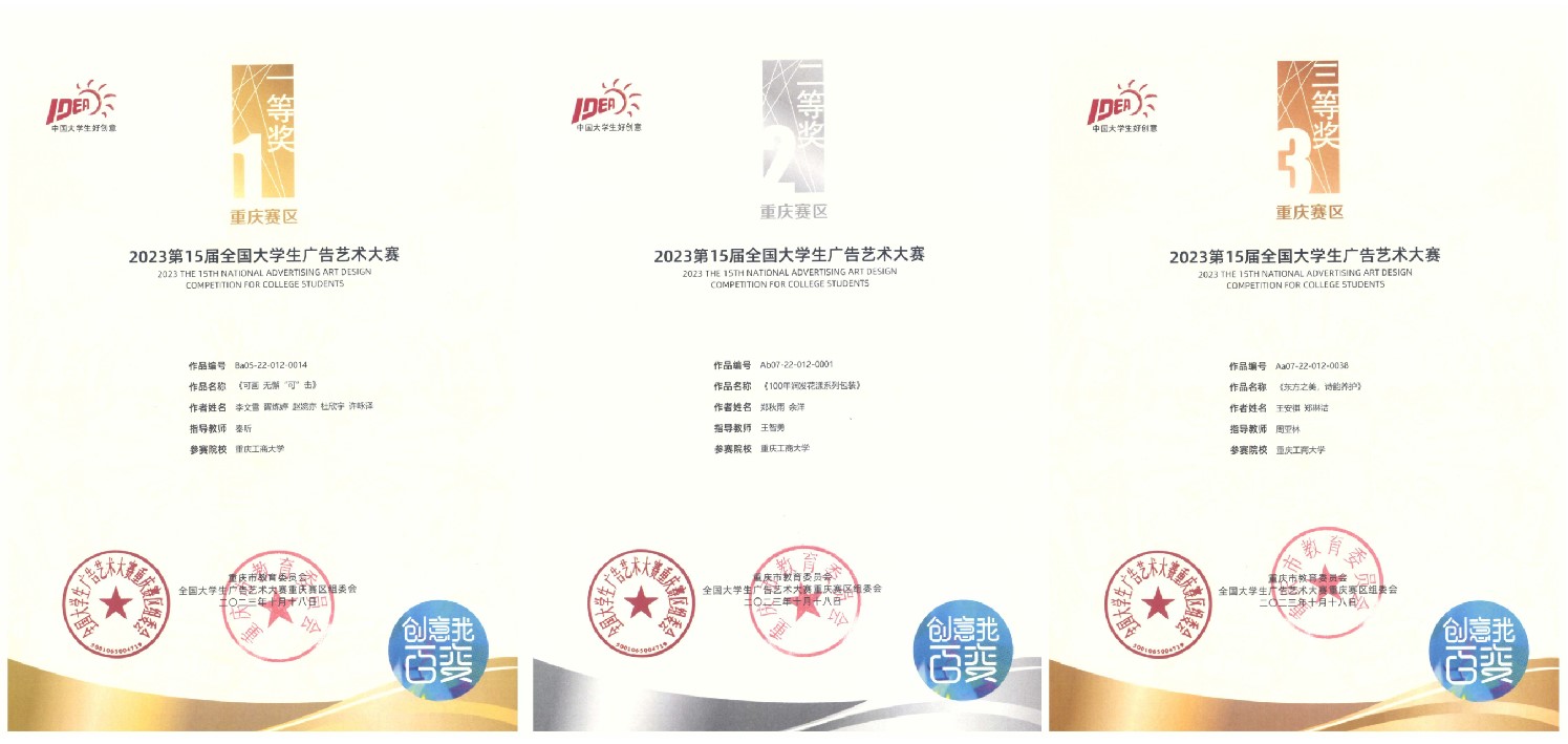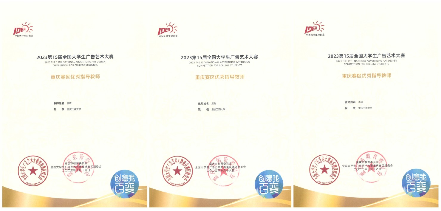 近日,第十五届全国大学生广告艺术大赛(以下简称:大广赛)获奖名单公布,beat365学生在专业教师指导下的参赛作品获全国赛区二等奖4项、三等奖6项、优秀奖25项;重庆赛区一等奖9项、二等奖9项、三等奖51项、优秀奖203项。艺术学院秦昕、黄薇、王卓尔,现代国际设计艺术学院李洋,文学与新闻学院王烨、周莹6名老师荣获重庆赛区优秀指导教师。