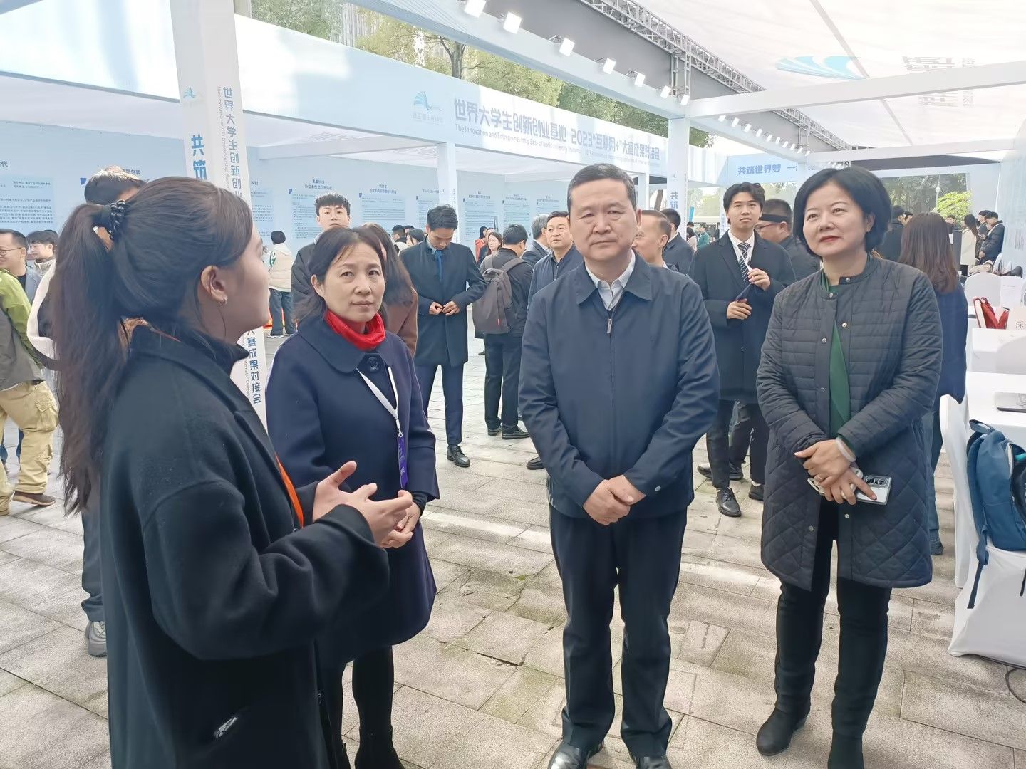 在beat365“互联网+”大赛项目展示区前,教育部高等教育司武世兴副司长和市教委副主任蒋云芳听取了项目组的汇报,对项目给予高度评价,认为其创新思维打破了技术壁垒,项目成果对全国松材线虫病枯死树普查及监测具有重大的示范意义和创新开拓性。
