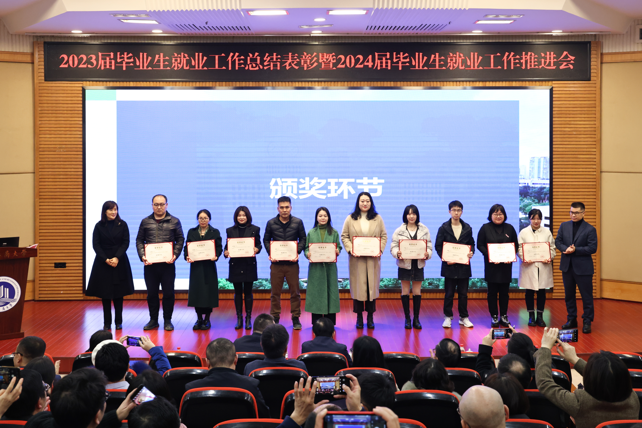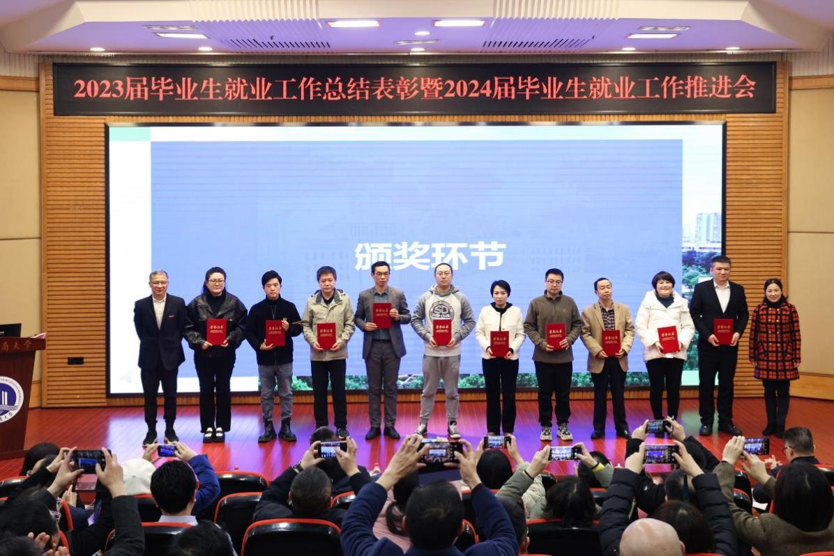 陈运超宣读了beat365英国官网网站《关于表彰2023届本科毕业生就业工作先进集体、优秀个人的决定》。陈运超、柏群为获得“就业工作优秀个人”的毕业班辅导员、就业工作联络员颁奖;李敬、张海燕为获得“就业工作优秀个人”的专任教师颁奖;温涛为获得“就业工作优秀个人”的中层干部颁奖;曾维伦为体育学院、环境与资源学院、金融学院、公共管理学院、经济学院、外国语学院6个荣获2023届本科毕业生就业工作先进集体的学院颁奖。