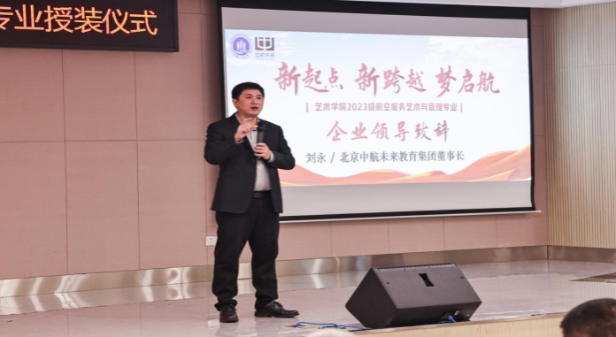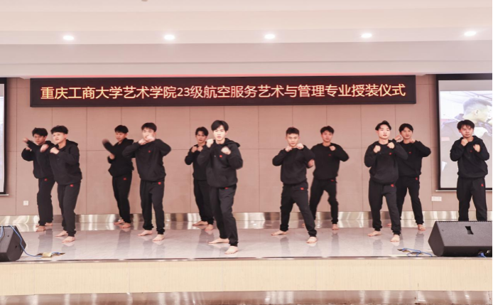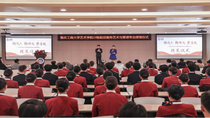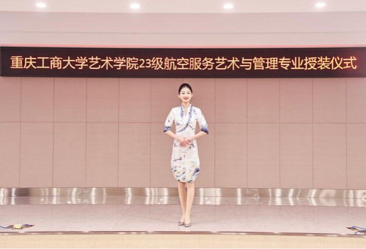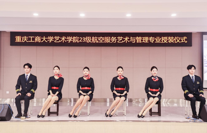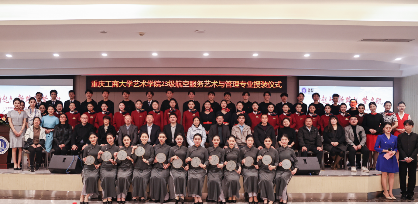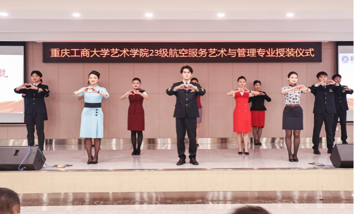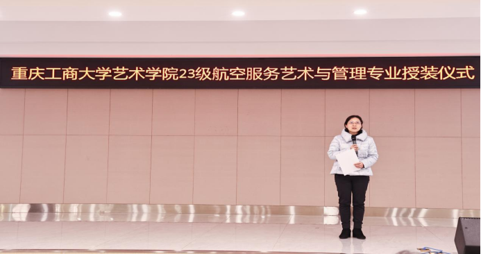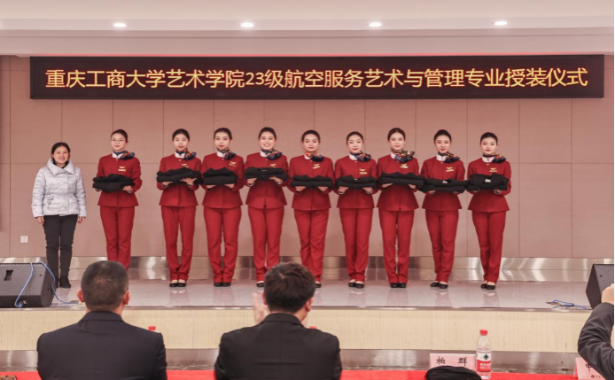 1月7日,艺术学院航空服务艺术与管理专业制服授装仪式在beat365英国官网网站南岸校区学生就业指导中心报告厅举行。副校长柏群,北京中航未来教育集团董事长刘永、副总裁张鹏、教研总监张利,安徽云翔未来科技有限公司总经理彭春,党委学工部部长申卫东,国内合作发展处处长刘代成,教务处处长骆东奇,招生就业处处长钟增胜,财务处处长王燕,艺术学院党政领导、教师代表和全体2023级航空服务艺术与管理专业学生参加了活动。
