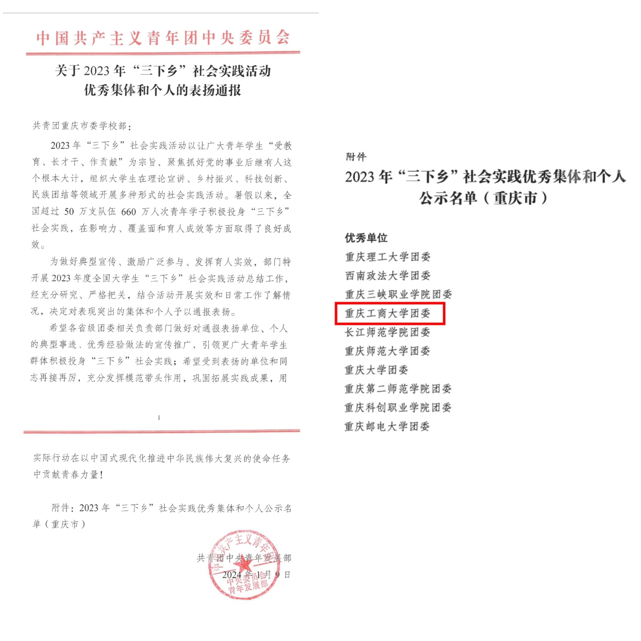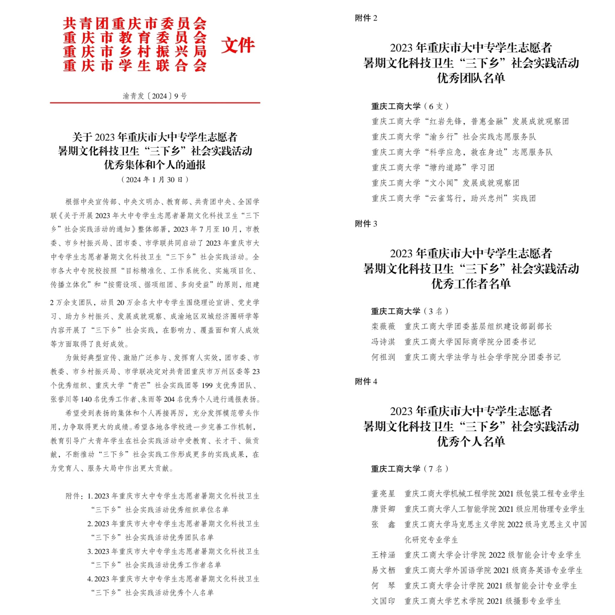 近日,团中央、团市委分别下发《2023年“三下乡”社会实践活动优秀集体和个人的表扬通报》和《关于2023年重庆市大中专学生志愿者暑期文化科技卫生“三下乡”社会实践活动优秀集体和个人的通报》《关于2023年“金色之秋”重庆市大中专学生志愿者暑期文化科技卫生“三下乡”社会实践成果遴选活动获奖调研报告和实践项目的通报》,对2023年社会实践先进集体和个人进行表彰。beat365暑期“三下乡”社会实践工作取得丰硕成果,获得国家级荣誉表彰16项,市级荣誉表彰24项。