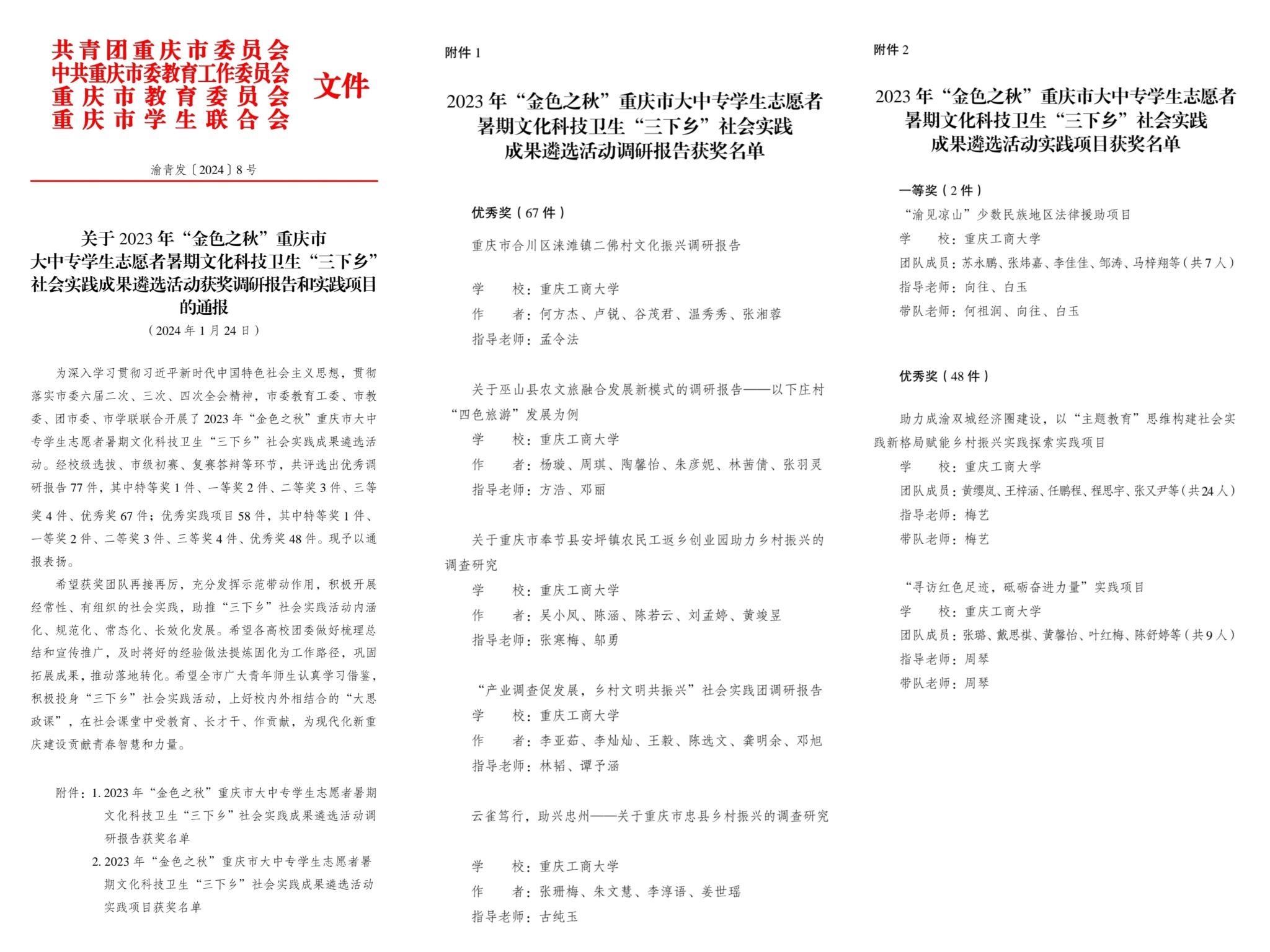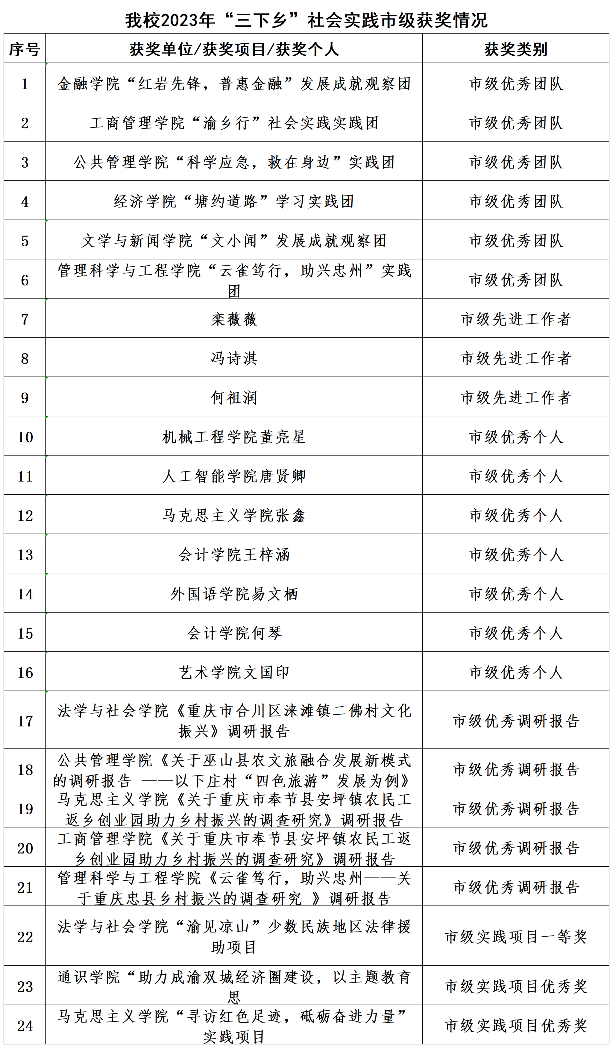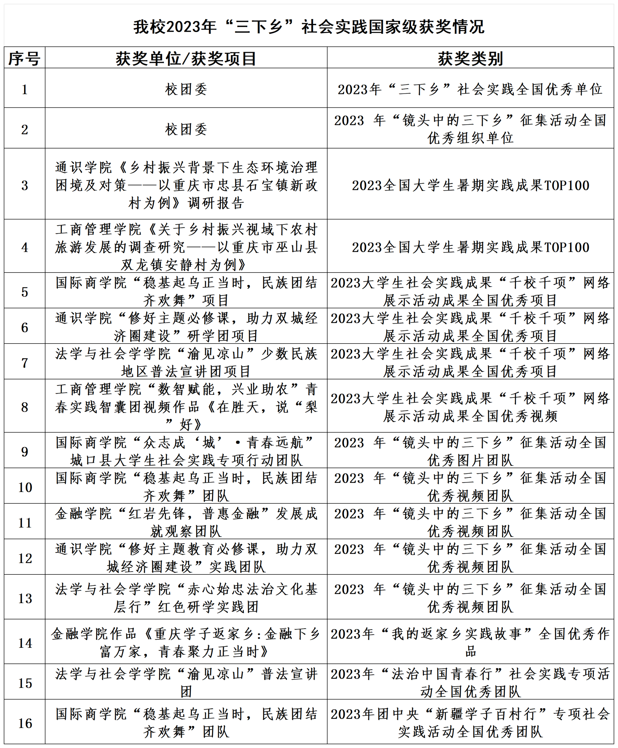在重庆市“三下乡”社会实践活动总结评选中,金融学院“红岩先锋,普惠金融”发展成就观察团等6支团队获市级优秀团队、校团委栾薇薇老师等3位教师获市级优秀工作者、机械工程学院董亮星等7位同学获市级优秀个人;在“金色之秋”重庆市“三下乡”社会实践成果遴选活动中,法学与社会学学院《重庆市合川区涞滩镇二佛村文化振兴》调研报告等5项调研报告获市级优秀、通识学院“助力成渝双城经济圈建设,以主题教育思维构建社会实践新格局赋能乡村振兴实践探索”实践项目等3个实践项目获市级奖项。