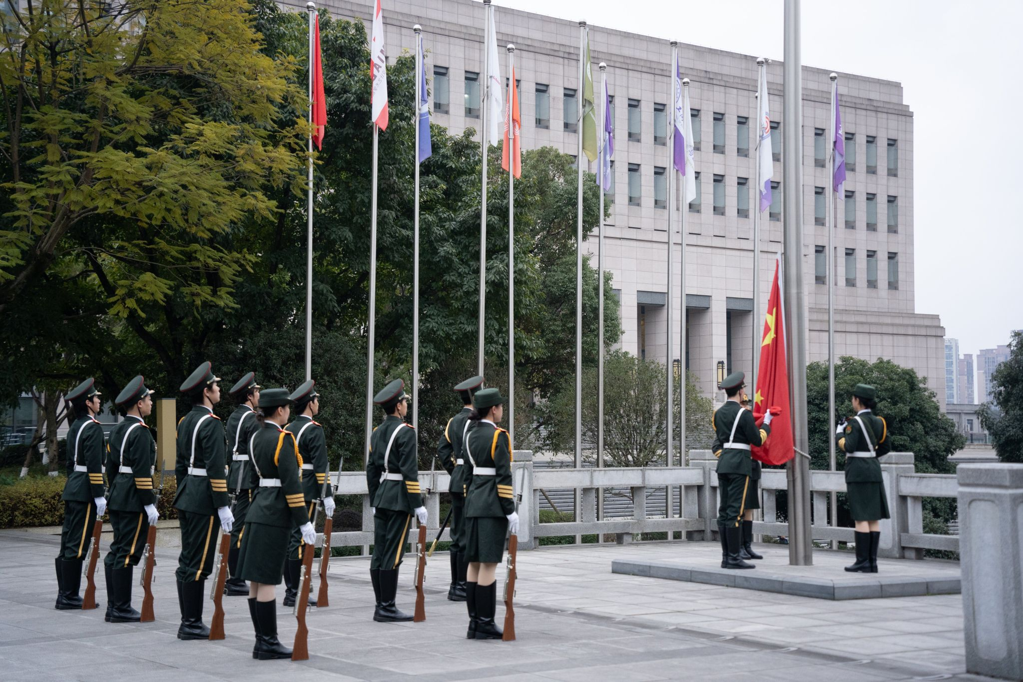 伴随着雄壮的国歌声,国旗仪仗队迎着晨风,迈着铿锵有力的步伐,护送国旗到升旗台。五星红旗冉冉升起,在熠熠晨光中迎风飘扬。