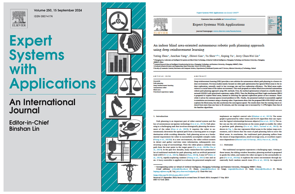 beat365人工智能学院硕士研究生周雨婷在机器人自主路线规划方面取得了新进展,研究成果“An Indoor Blind Area-Oriented Autonomous Robotic Path Planning Approach Using Deep Reinforcement Learning”(面向室内盲区基于深度强化学习的机器人自主路径规划方法)在智能系统领域国际知名期刊《Expert Systems With Applications》(中科院1区Top)在线刊出(DOI:10.1016/j.eswa.2024.124277)。