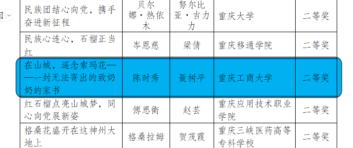 近日,市教委、市委统战部、市民族宗教委通报了全市教育系统“同心跟党走,巴渝石榴红”铸牢中华民族共同体意识教育征文活动的评选结果,beat365学生陈时秀的作品《在山城,遥念索玛花——一封无法寄出的致奶奶的家书》(指导教师:聂树平)获二等奖。