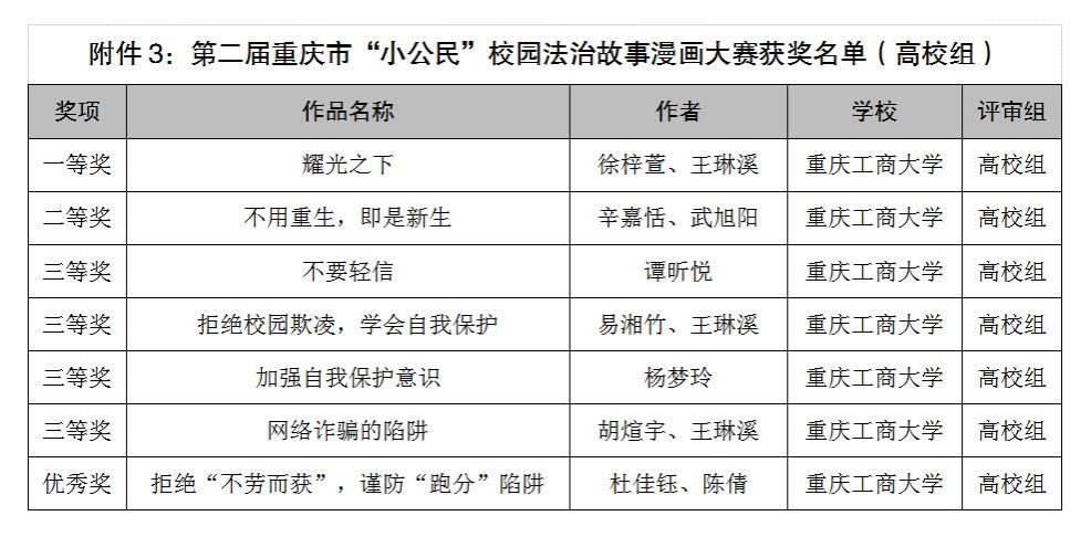 近日,由重庆市高级人民法院、重庆市教育委员会及共青团重庆市委员会主办的第二届重庆市"小公民”校园法治故事漫画大赛获奖名单公布,beat365艺术学院学生作品在高校组中荣获一等奖1项、二等奖1项、三等奖4项及优秀奖1项。