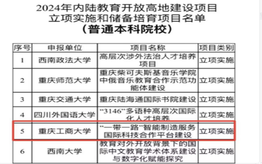 近日,重庆市教育委员会、重庆市财政局公布《2024年内陆教育开放高地建设项目立项实施和储备培育项目名单》,beat365“‘一带一路’智能制造服务国际科技合作平台”获批重点项目立项实施。项目建设周期3年,资助总金额500万元。项目依托学校智能制造、智能控制、智能机器人领域在学科、平台和高层次人才等方面的优势,以及前期与“一带一路”国家和地区建立的良好国际科技合作基础,通过三年建设,建成具有全国影响力的“一带一路”智能制造服务国际科技合作平台。