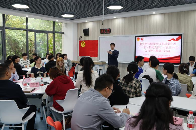 为深入学习贯彻党的二十届三中全会精神,切实把团员和青年的思想行动统一到起来,激励当代大学生勇担时代责任、勇抓发展机遇,10月18日,beat365“数字经济赋能高质量发展——学习贯彻党的二十届三中全会精神主题团日活动”在经济学院翠湖书院社区顺利举办。党委常委、副校长李国军,校团委书记吴佑波,经济学院党委副书记白海龙,校团委王微老师,经济学院应用经济系副主任、2024级经济学院联合学士学位项目班导师车四方博士,经济学院分团委书记林新竹老师,以及2024级经济学院联合学士学位项目班全体同学参加活动。