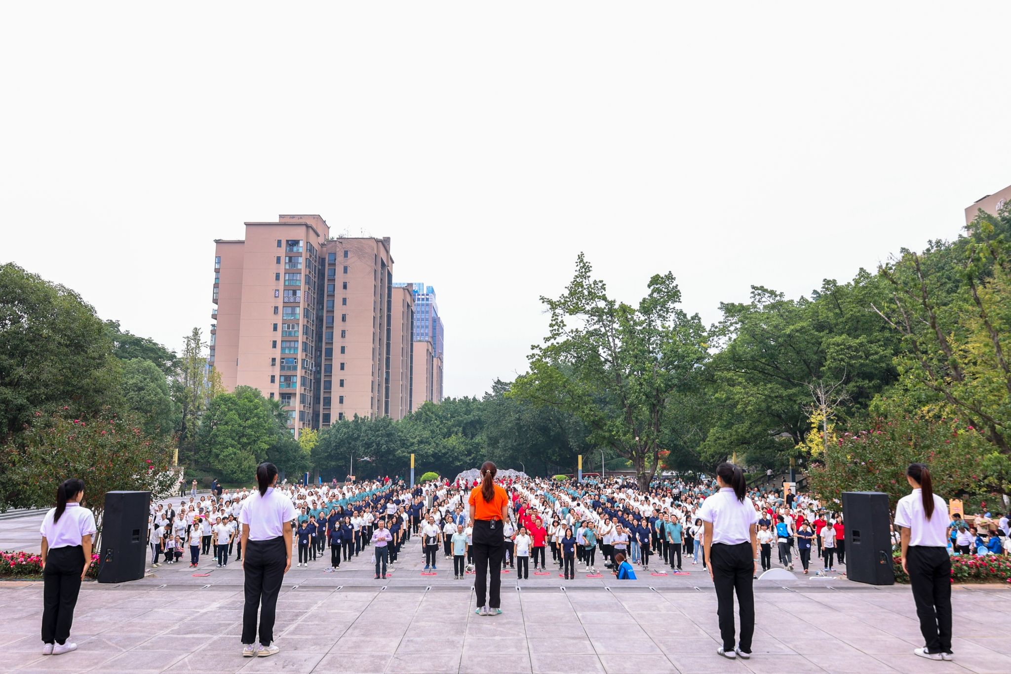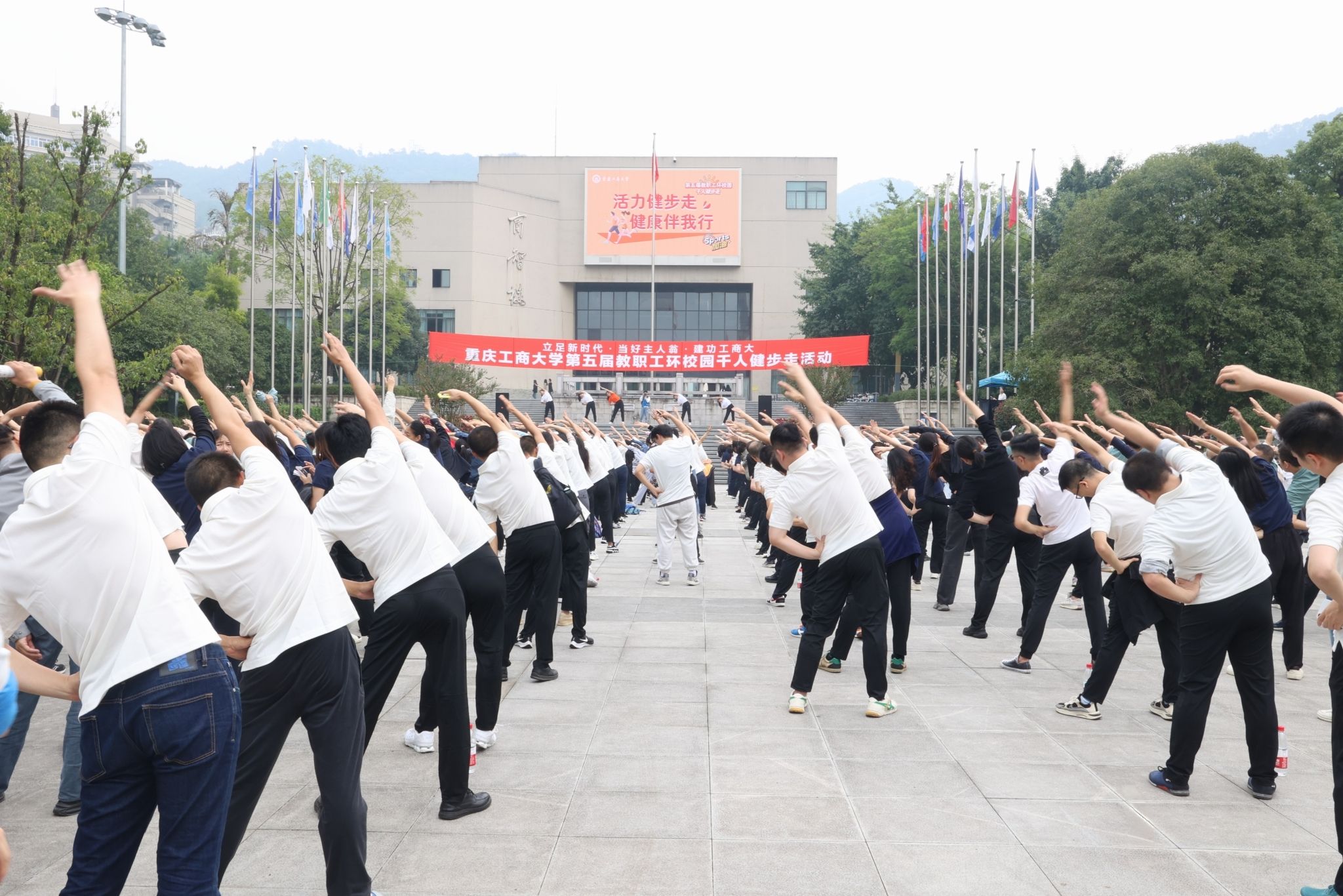 比赛正式开始前,伴随着激昂的音乐,所有参赛教职工开始了出发前的热身活动。