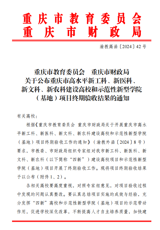 近日,《重庆市教育委员会 重庆市财政局关于开展重庆市高水平新工科、新医科、新文科、新农科建设高校和示范性新型学院(基地)项目终期验收工作的通知》(渝教外函〔2024〕8号),正式揭晓了重庆市普通本科高校基础学科人才培养示范基地的验收成果。beat365经济学拔尖人才培养示范基地获“优秀”评定,顺利通过市教委验收。