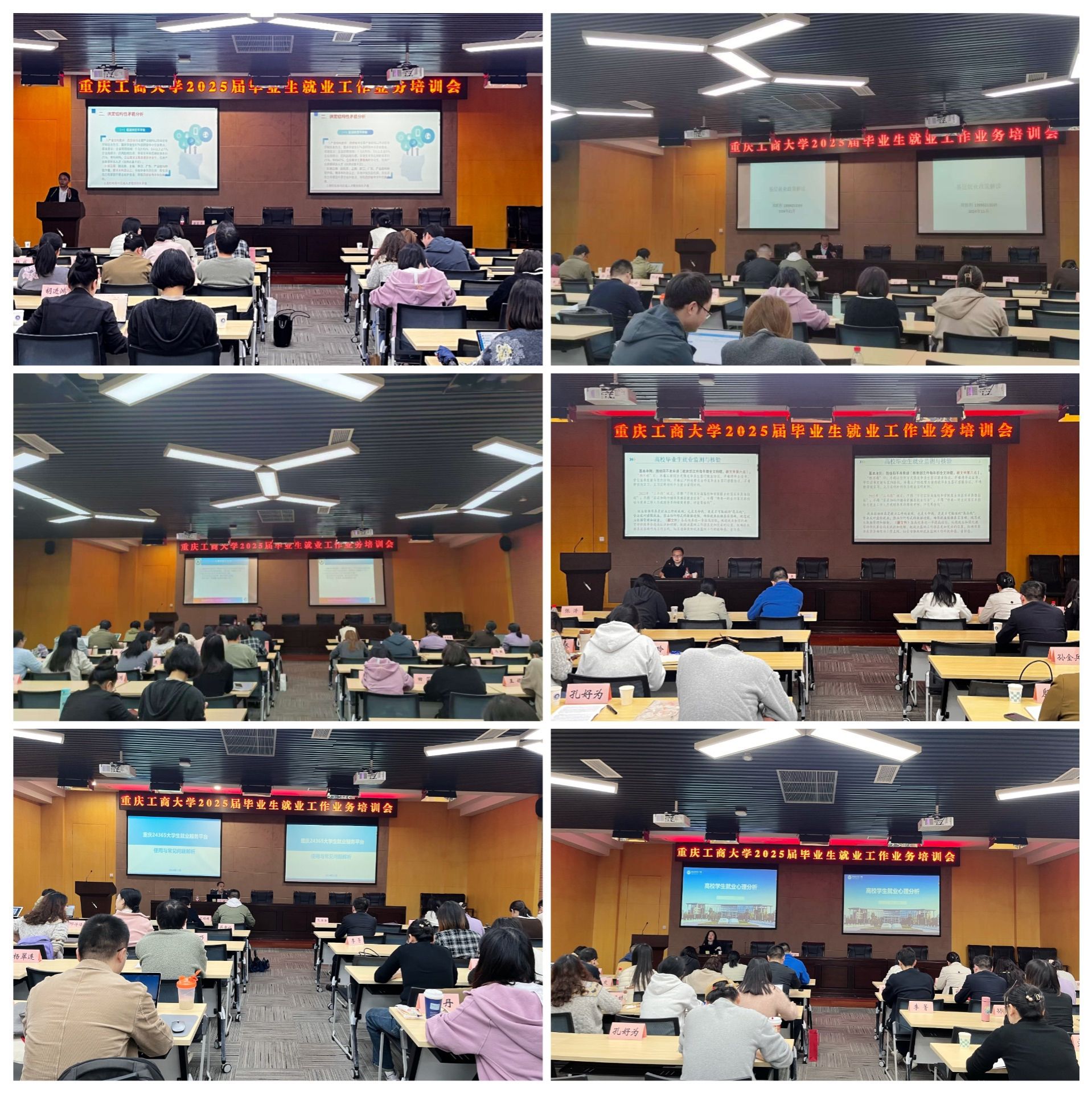 11月7日下午,胡晓、尹亮分别作《高校学生就业心理分析》《就业监测与核查有关政策》专题讲座。11月8日上午,郑胜利、卜靖分别作《基层就业政策解读》 《重庆 24365 大学生就业服务平台使用与常见问题解析》专题讲座。11月8日下午,唐雪平、许杨分别作《就业形势政策与解读》《职业生涯规划大赛政策解读》专题讲座。