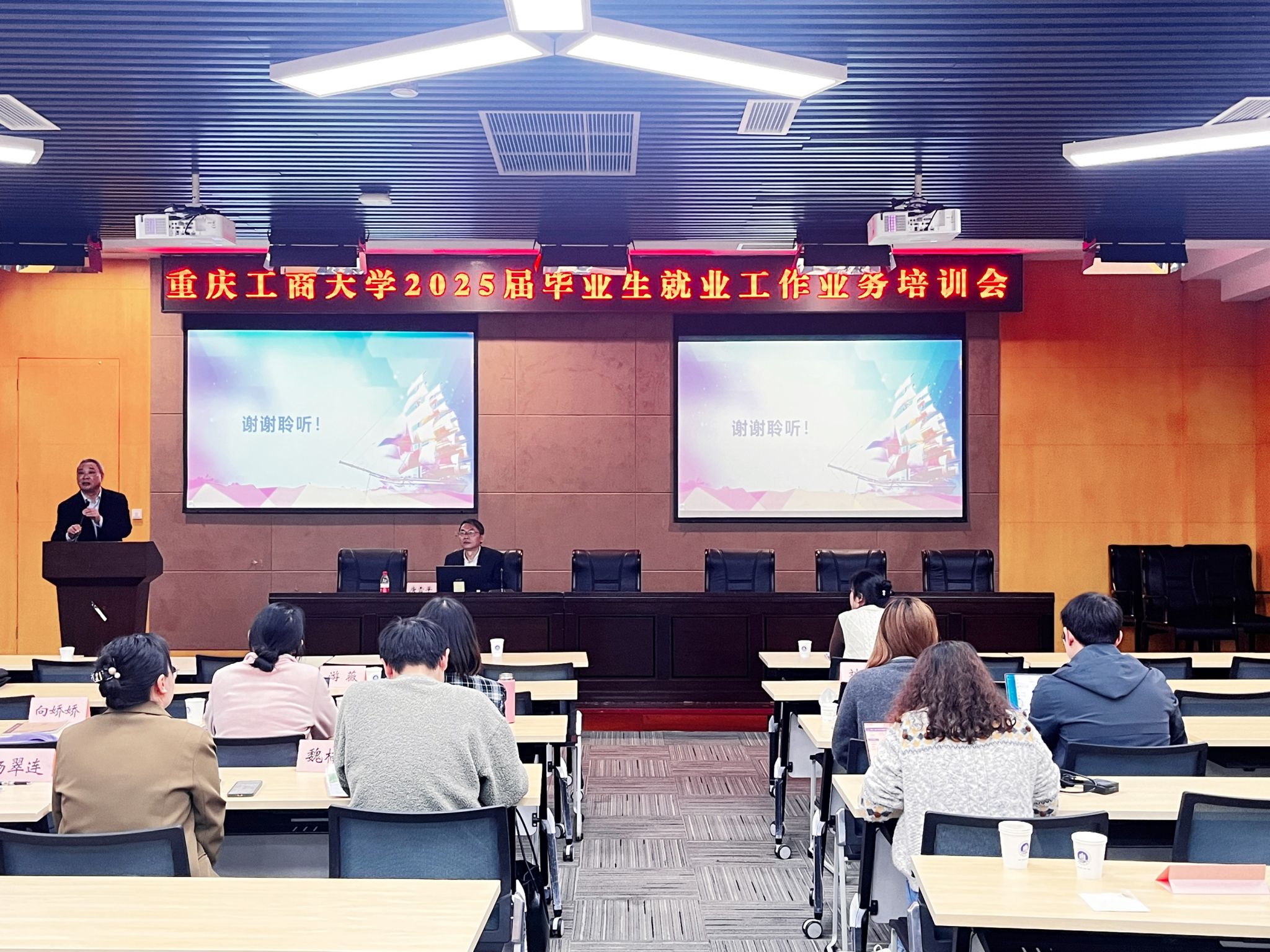 11月7日—8日,beat365在图书馆多功能厅召开2025届毕业生就业工作业务培训会。会议邀请了重庆市学生就业与创新创业服务中心主任唐雪平、纪检委员郑胜利、综合服务部部长许杨、就业指导部部长尹亮、信息市场部副部长卜靖,西南政法大学行政法学院党委副书记胡晓开展培训。学校党委常委、副校长李国军,招生就业处处长钟增胜、副处长周婷出席会议,招生就业处就业中心全体人员,各学院就业联络员、全体2025届毕业班辅导员,《大学生职业生涯规划与就业指导》授课教师参加培训。会议由周婷主持。