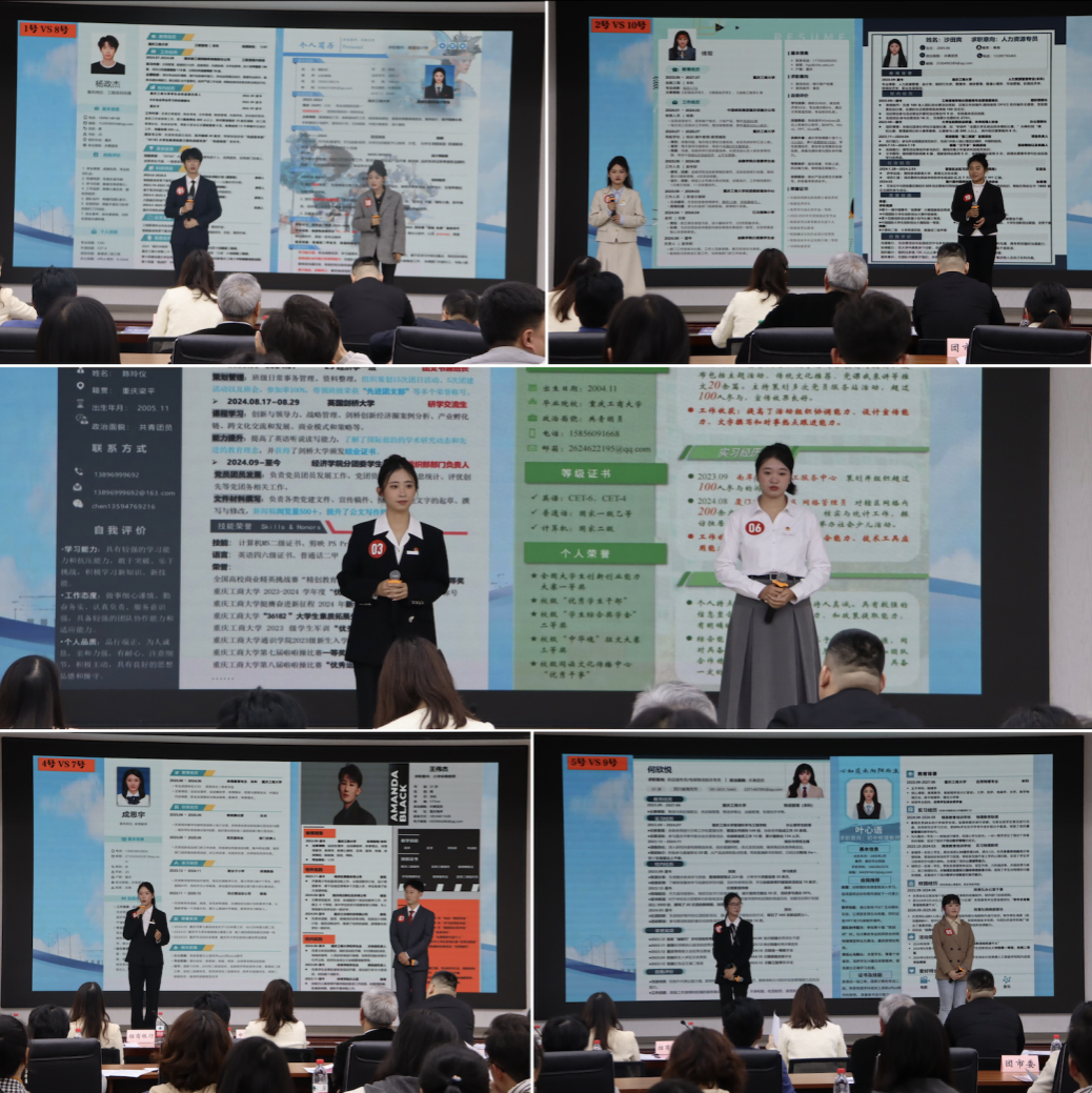 比赛设置了“我的简历我来说、简历对对碰”两个环节。在“我的简历我来说”中,10位参赛选手结合简历设计思路,意向选择岗位,从专业特长、所得荣誉、实践经历与自我评价等方面介绍自己,展示了精心设计制作的简历,并阐述自身职业发展规划。在“简历对对碰”环节,评委针对选手的简历和讲演内容即兴提问,侧重考验选手的应变抗压能力和求职应试技能。选手们面对评委老师们的提问,冷静沉稳、认真思考、有条不紊的进行回答。
