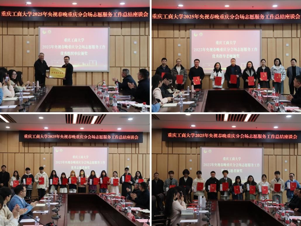会上,文学与新闻学院党委书记潘焱作为学院代表进行工作回顾。她谈到,学院高度重视此项工作,与重庆广播电视集团紧密协作,确保工作高效有序开展;辅导员认真履职,全力做好志愿者保障工作。未来,学院将认真总结经验,着力培养有高度社会责任感的新闻传播人才,为学校和社会发展积极贡献。校团委书记吴佑波作工作总结并宣读表彰文件。他谈到,在学校党委的坚强领导下,校团委与文学与新闻学院协同联动,将此次志愿服务打造为实践育人的重要平台。来自新闻传播、艺术、人工智能等专业的130名本科生、硕士生,以高度的责任感和使命感,历时一个多月,昼夜奋战在志愿服务一线。他们以专业素养和饱满热情,为央视春晚重庆分会场的圆满举办贡献力量,充分展现重工商大学子的精神风貌和责任担当。