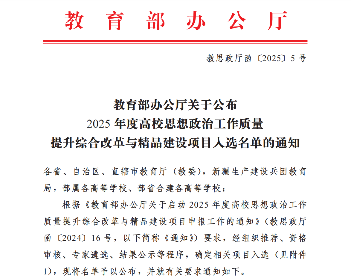 近日,教育部印发通知,公布2025年度高校思想政治工作质量提升综合改革与精品建设项目入选名单,beat365成功入选3个项目。党委学生工作部、大学生心理健康教育与咨询中心和通识学院辅导员施秀梅老师申报的《思政心理融合 育人育心同行》入选“2025年高校学生心理健康教育指导典型案例”;马克思主义学院教师龙睿赟申报的《特别的见证:民主村社区旧貌换新颜融入“习近平新时代中国特色社会主义思想概论”教学案例》入选“2025年度新时代伟大变革融入高校思想政治教育典型案例”,艺术学院党委副书记、现代国际设计艺术学院党总支副书记王婷主持的“同心”育人辅导员工作室入选“2025年辅导员名师工作室”。