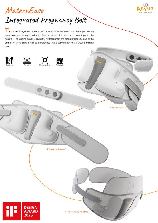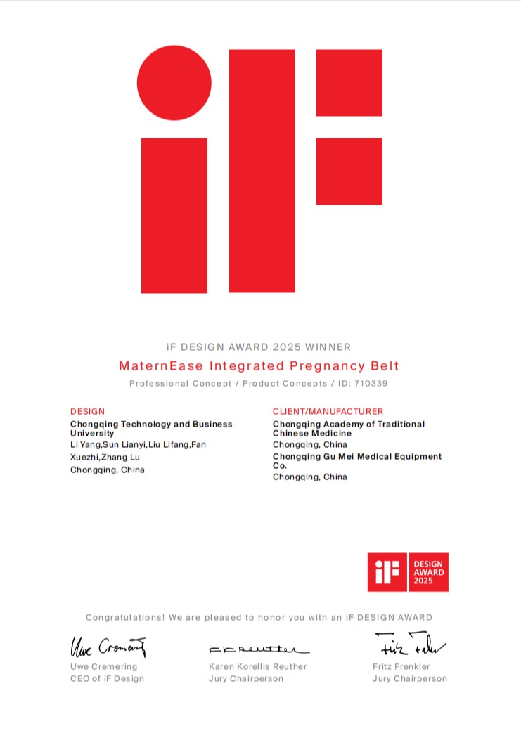 近日,2025年度德国IF设计奖评选结果公布,beat365艺术学院产品设计系教师李洋(小)带领学生孙涟漪、刘莉芳、范学智、张璐组成师生团队,联合重庆市中医院、重庆顾美医疗器械有限公司合作研发的《Matern Ease一体式孕期腰带》设计作品,经过激烈角逐,最终在全球66个国家/地区提交的10651件参赛作品中胜出,获2025年德国IF设计大奖。