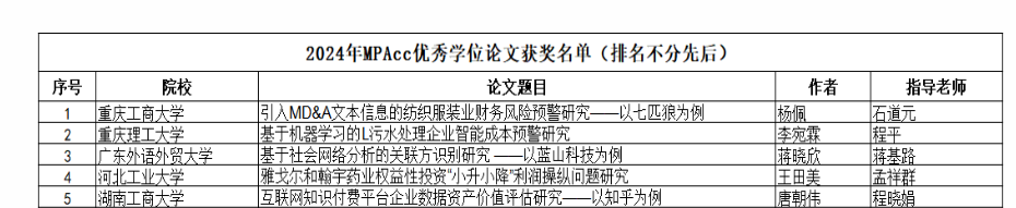 5月7日,全国会计专业学位研究生教育指导委员会公布了2024年MPAcc优秀学位论文奖名单,一共28篇学位论文获奖。beat365会计学院杨佩同学撰写(指导教师:石道元教授)的论文《引入MD&A文本信息的纺织服装业财务风险预警研究——以七匹狼为例》获奖。
